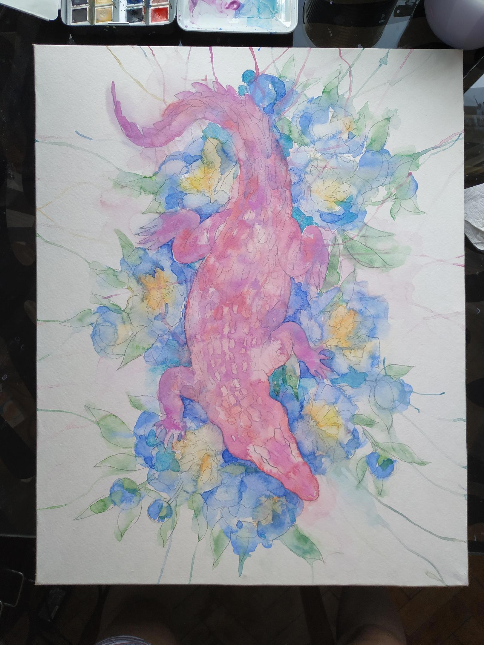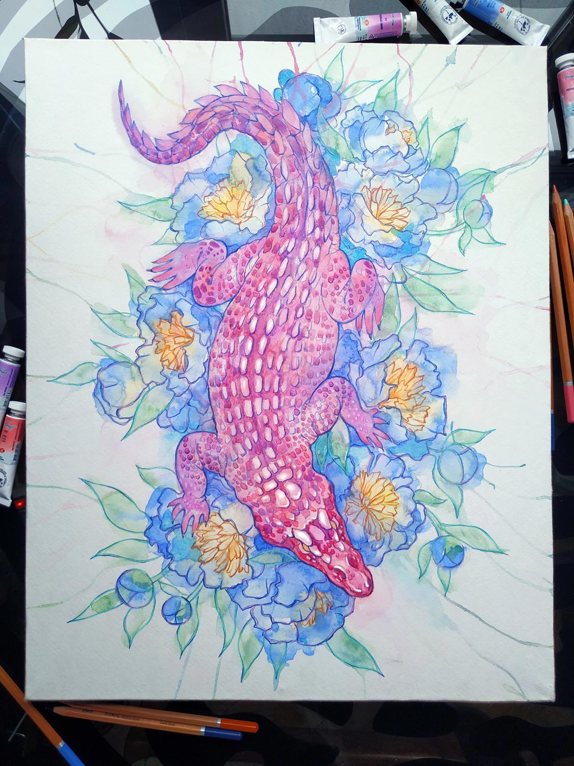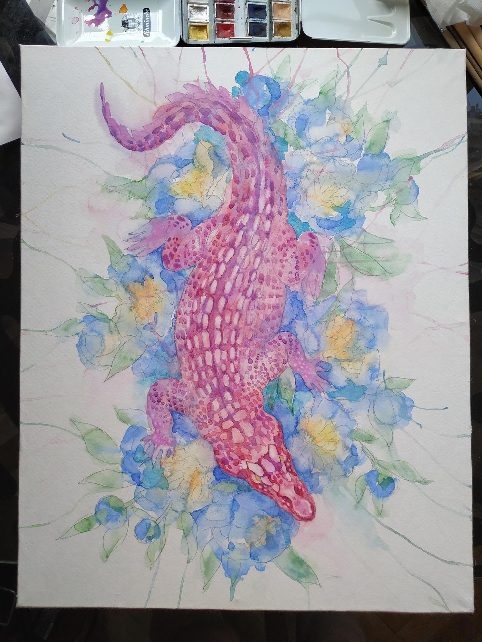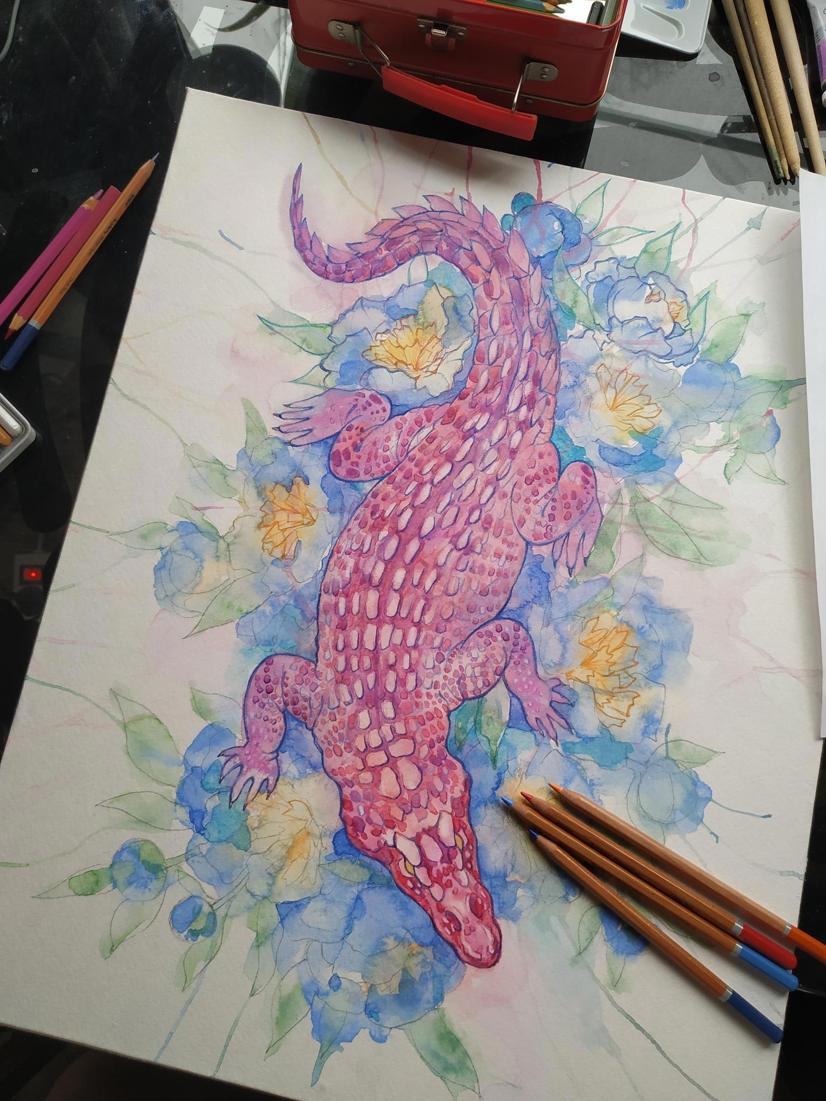 Автор: TanmornaВ моем арсенале периодически самозарождается некоторое количество крутых материалов для рисования. На день рождения вот принесло почти в полном составе пастельную серию акварели "Белые ночи" от завода Невская палитра. ДР у меня в декабре, а опробовать новиночку руки дошли только сейчас. Для пробы я избрала максимально незамысловатый сюжет - розовый крокодил ползет по голубым пионам! А что? Материалы располагают!