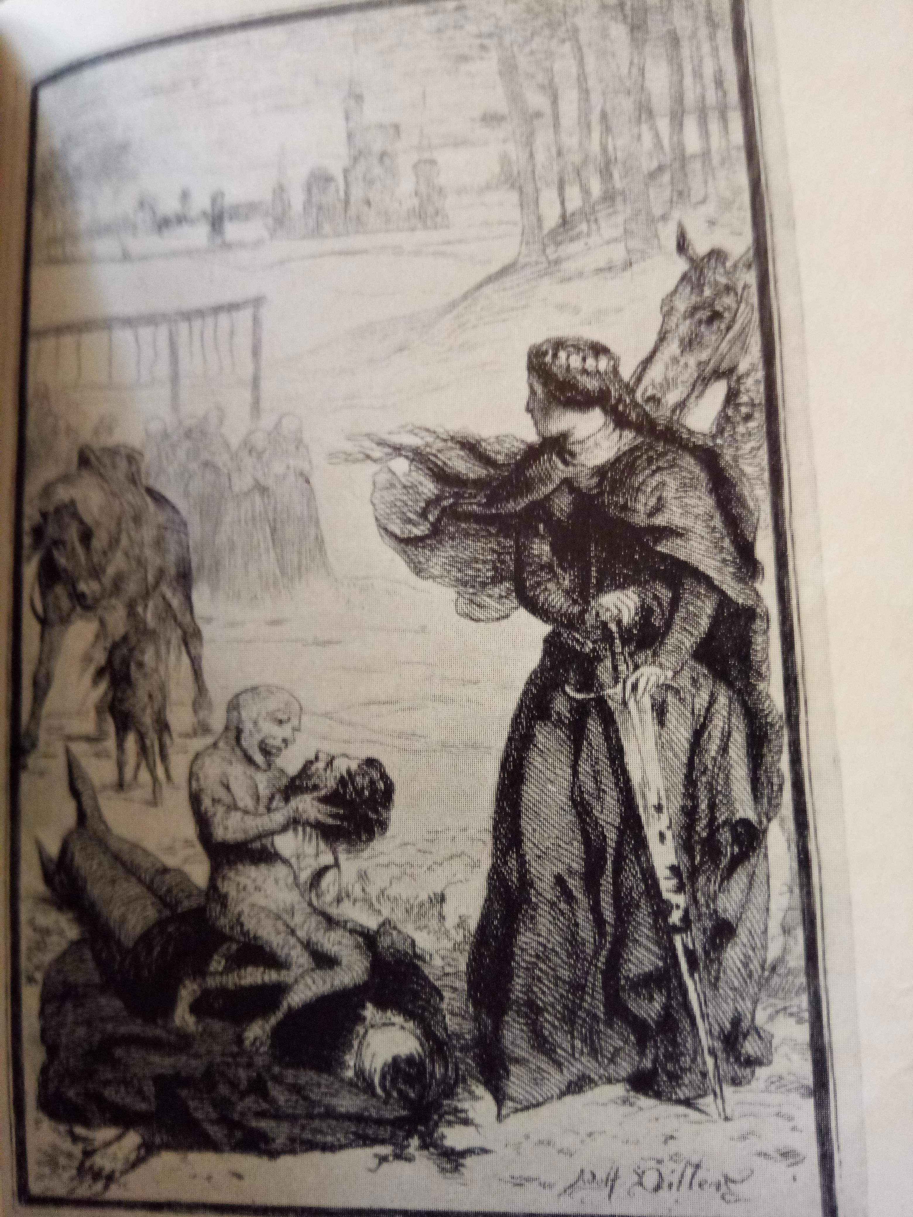 Одной из таких находок был томик Шарля де Костера "Фламандские легенды" из серии "Литературные памятники". Среди легенд оказалась неописуемо жуткая повесть "Сир Галевин" о рыцаре Сиверте Галевине, который после встречи с Каменным человечком обрел золотой серп и убивал им девушек, вырезая их сердца и выпивая оттуда кровь. На гравюре ниже - смерть самого Галевина: