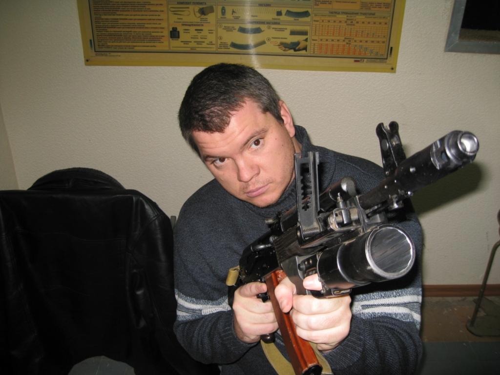Некоторое  время издательство думало, а потом пришел вопрос от художника: "Борис, а  как выглядит стреляющий из подствольного гранатомета солдат?". Ну, я  тогда служил в ОМОН, зашел я после смены, когда пистолет сдавал, в  оружейку, взял из сейфа свой автомат и свой ГП-30, дал в руки дежурному  фотоаппарат... И получилось вот это фото.