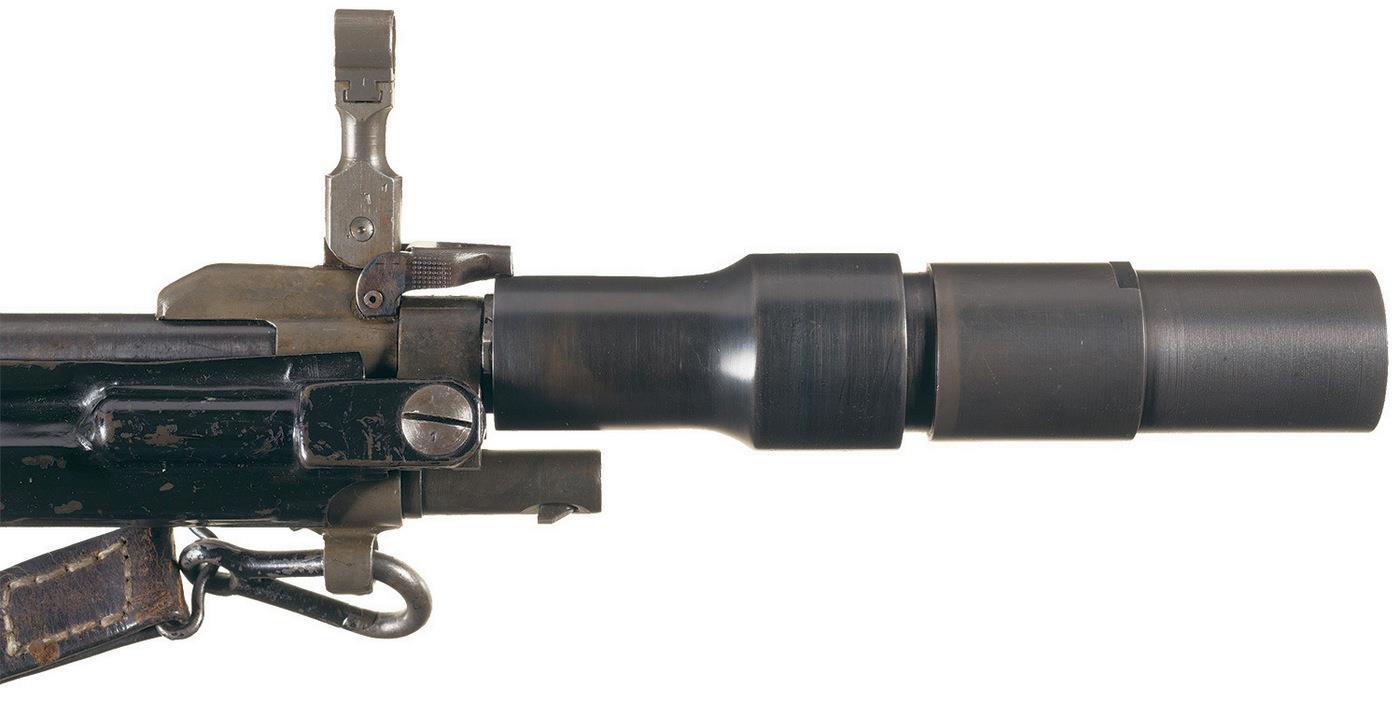Сначала обратите внимание на то, что прицельная мушка у них откидная – это чтобы не мешала во время транспортировки, или, не дай бог, при прыжке с парашютом. Но самое интересное не это. Заметили, что дульный тормоз с дырочками не виден? Вместо него совсем другая забабаха. Вот! Это на самом деле не что иное, как тридцатимиллиметровый гранатомёт Gewehrgranatengerat-2 (фух… ну и названия у немцев). Он мог стрелять либо осколочно-фугасными, либо кумулятивными гранатами. Формально дальность его была до 250 метров, но на самом деле мог использоваться на дистанции не более 100 метров. Дальше – большое рассеивание и низкая надёжность.
