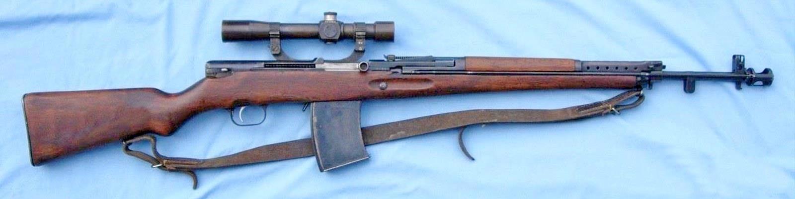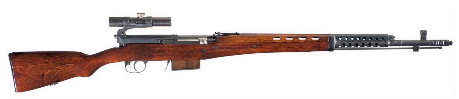 Она могла стрелять даже очередями со скорострельностью 800 выстрелов в минуту. Потом у неё эту функцию отняли (вариант 1938 года). Потом вообще перестали выпускать, но взамен начали производить СВТ-40. Вот она, тоже в снайперском исполнении: