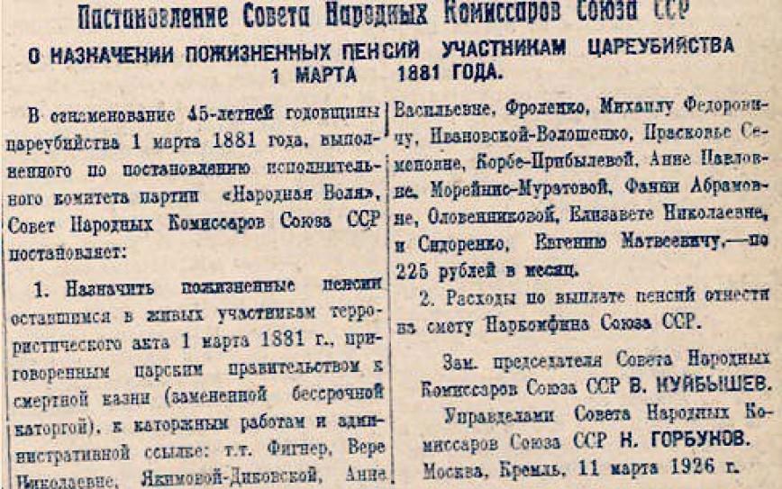 докУмент за подписью Молотова: "Совет Народных Комиссаров Союза ССР постановляет: Увеличить размер персональной пенсии участникам террористического акта 1 марта 1881 года: Вере Николаевне Фигнер, Анне Васильевне Якимовой-Диковской, Михаилу Фёдоровичу Фроленко, Анне Павловне Прибылёвой-Корба и Фани Абрамовне Морейнис-Муратовой — до 400 рублей в месяц с 1 января 1933 года. 8 февраля 1933 года, Москва, Кремль".