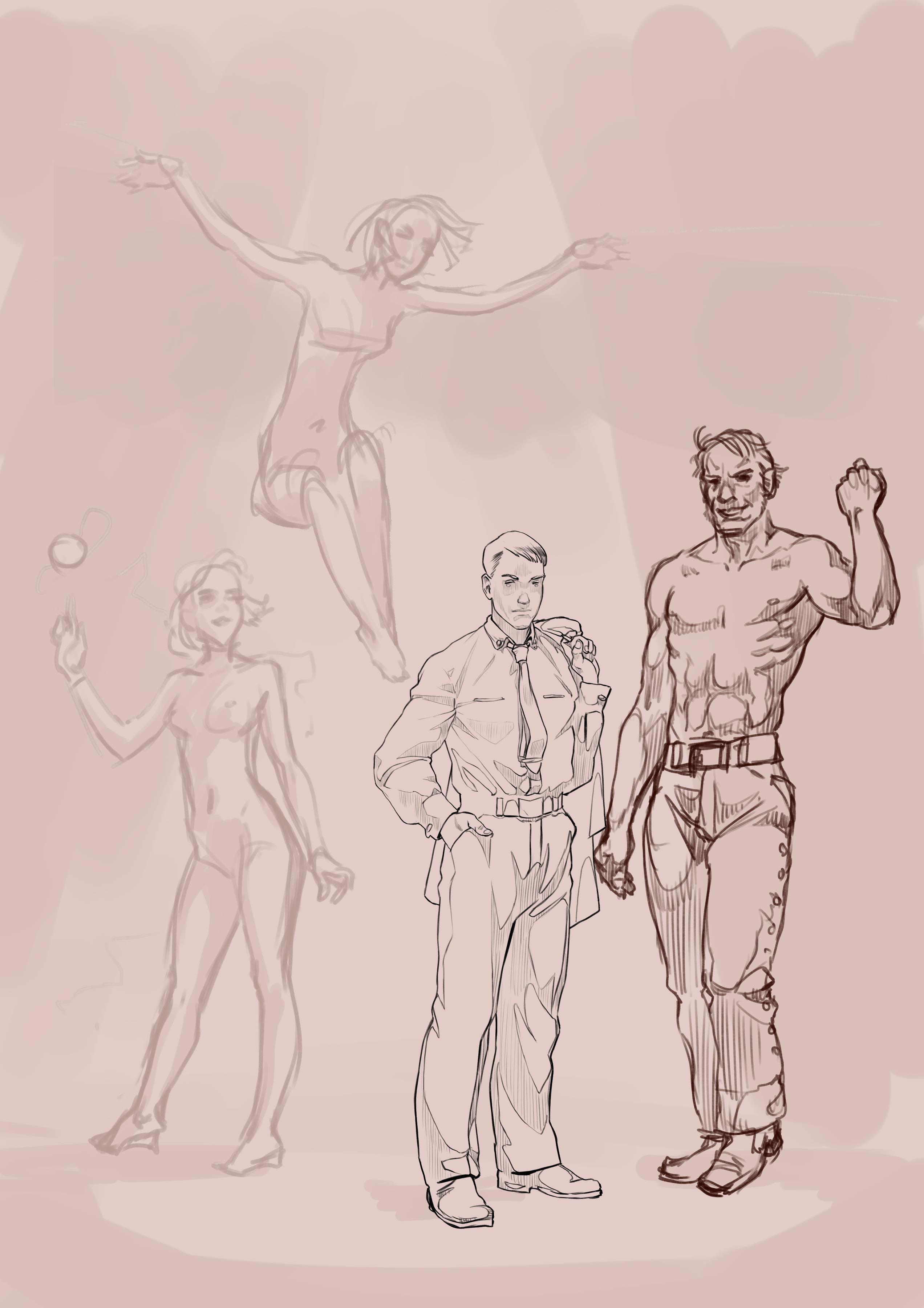 Опуская обсуждение с автором задумки и вносимые им коррективы на этапе рисования стадии создания изображения выглядели так: