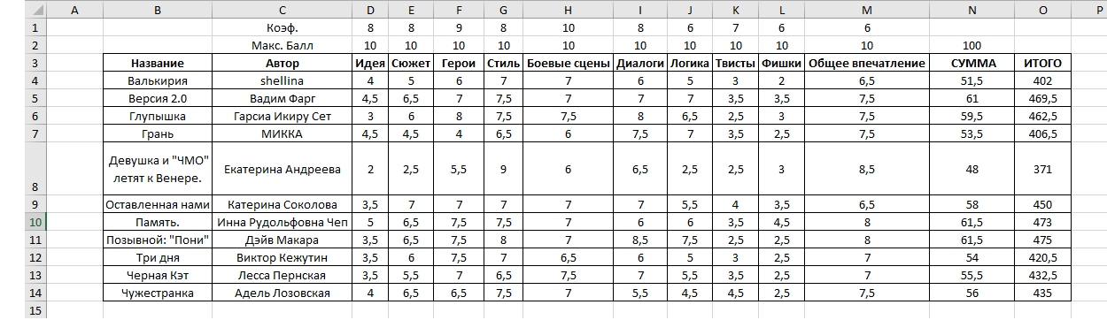 Пару слов о том как я решил оценивать. Я решил разбить на 10 критериев, которые, на мой взгляд, были важны именно для данного конкурса. Каждый критерий имел свой ранг значимости. Это нужно было для того, чтобы какие-то менее важные и более рандомные вещи вроде моего общего впечатления и вкуса влияли на оценку меньше, чем, например, боёвка. Естественно, все оценки субъективны сами по себе, т.к. я сам их выставлял. Но, полагаю, что подобная система должна была снизить субъективность. К тому же, например, лично мне нравится, когда логика повествования не оставляет кучи вопросов и минимизирует рояли в кустах и подобные вещи. Тем не менее в данном конкурсе она не является чем-то настолько важным как хорошая боёвка или персонажи, которым хочется поверить. Проще говоря, итог оценивался как сумма произведений коэффициентов значимости критериев и моих баллов для этих заданных критериев. Ну... в общем как-то так.