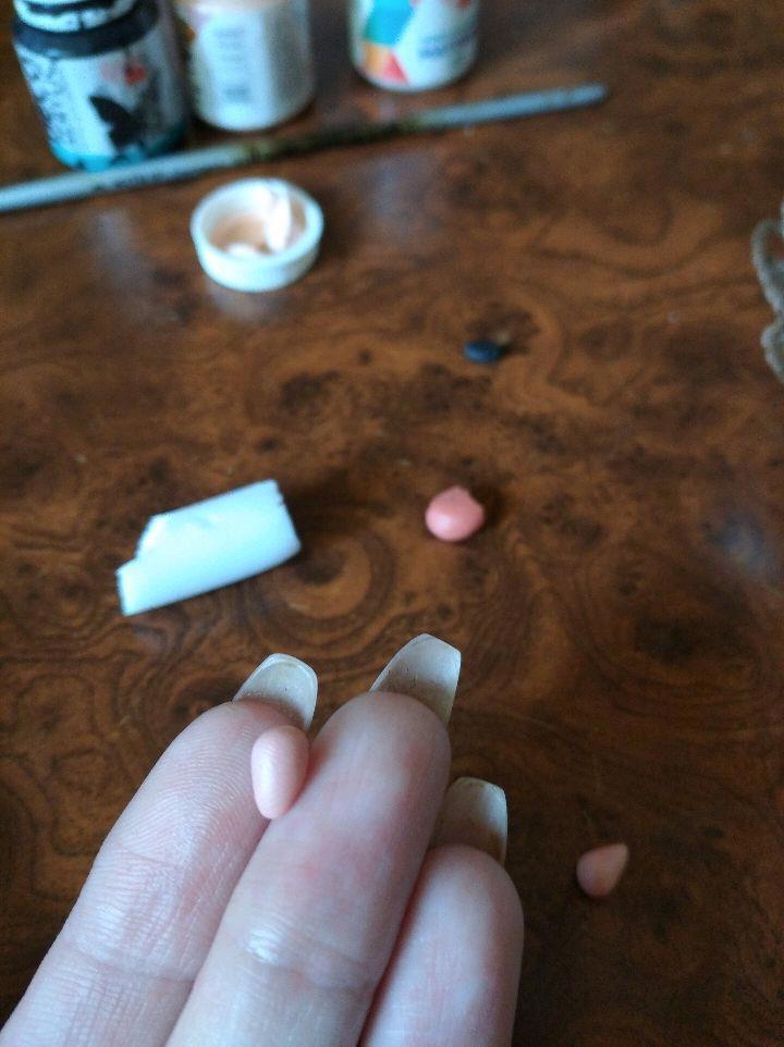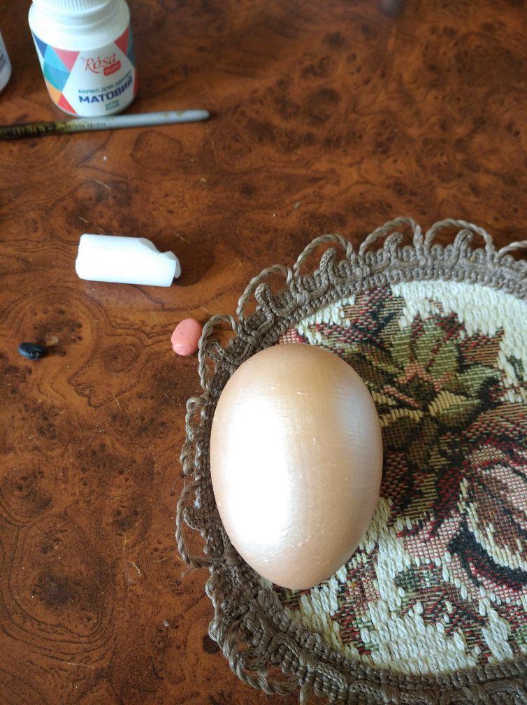 Ушки делаем из пластилина (или полимерной глины, такое ухо вообще можно на секунду приварить прямо на яйце и оно станет твёрдым). Скатываем вот такие продолговатые комочки. Лепим их на яйцо. Сплющиваем.