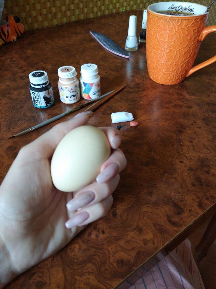 Нам понадобятся вареные яйца, акриловые краски, широкая и узкая кисточки, кусочек пластилина, не книжно-эротического, а из коробочки, или, как у меня - полимерной глины, чашка чёрного чаю с сахаром и без лимона.