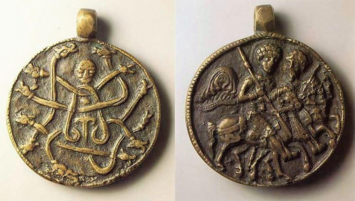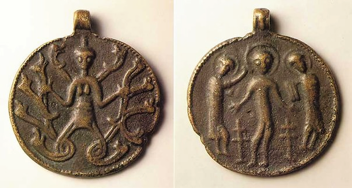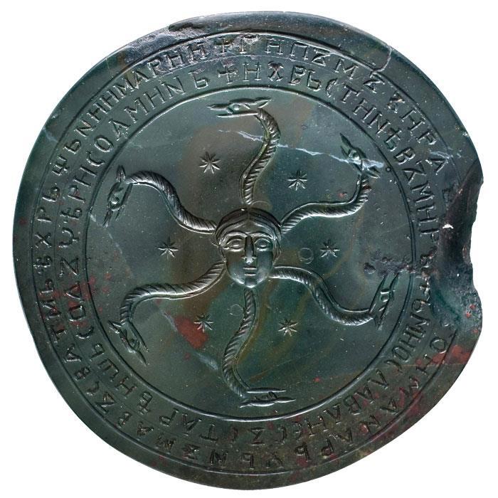А вот на реверсе было без вариантов. Там всегда была змееногая и змееволосая демоническая женщина, у которой, по преданию, было 12 имен. В Византии. откуда к нам и пришли эти амулеты, ее называли Истера, на Руси - Дъна.