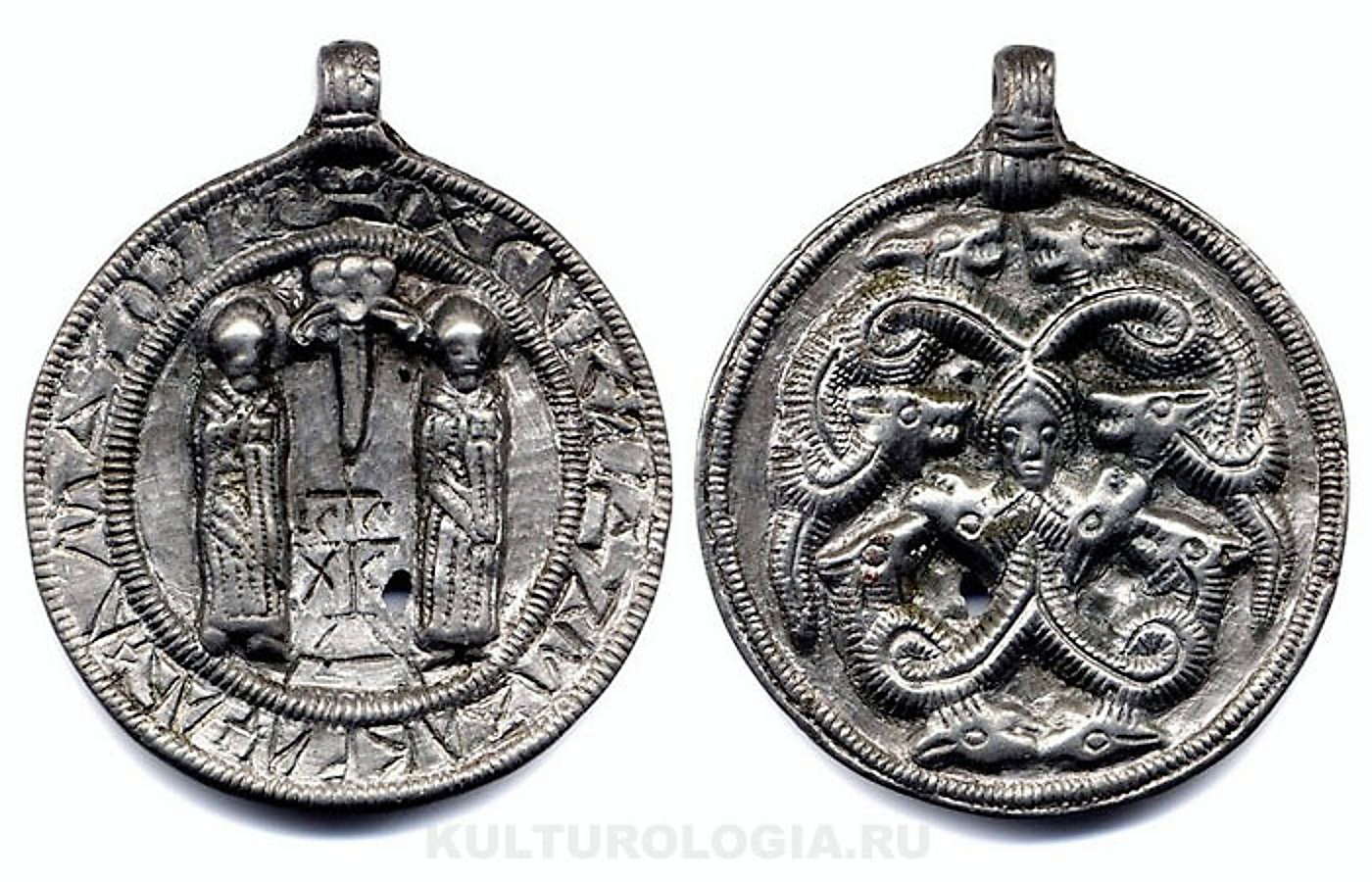 "Русские святые Борис и Глеб", змеевик, XII–XIII вв. Медь, литье. 6.5 × 5.5 см. Государственный Эрмитаж.