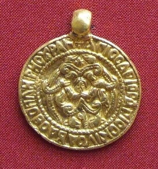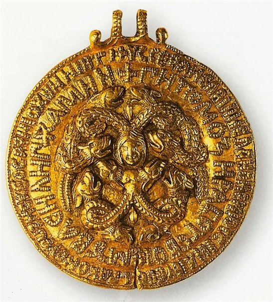 Змеевик XII века, Киев, золото. Диаметр – 4,8. Поступил в 1888 году из Императорской Археологической комиссии. Найден в 1886 году в деревне Ковшич бывшего Краснинского уезда Смоленской губернии. По месту находки назван «Смоленской гривной». Государственный Эрмитаж, инв. № 2032/1