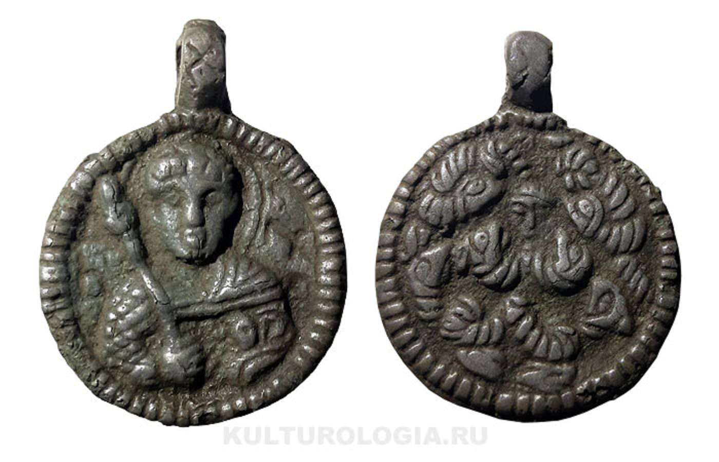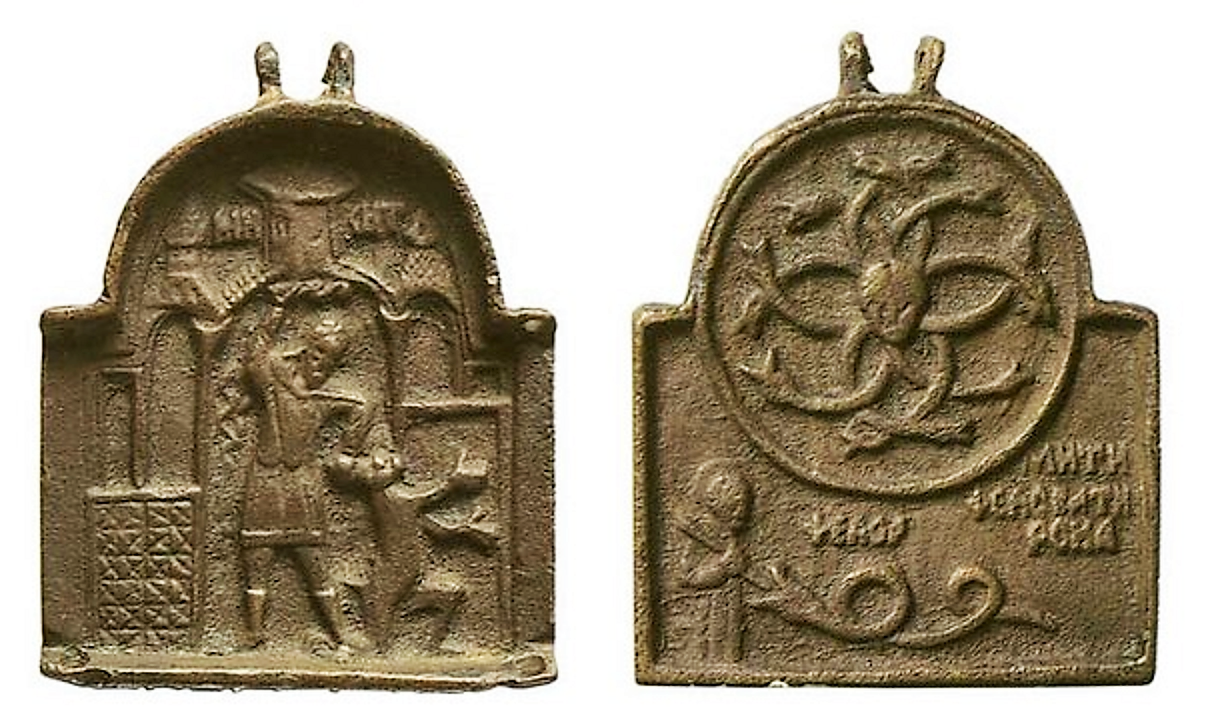 "Великомученик Феодор Стратилат", змеевик. Новгород (?) XIII–XIV вв. Красная медь, литье. Диаметр 5.2 см. Центральный музей древнерусского искусства им. Андрея Рублева, Москва.