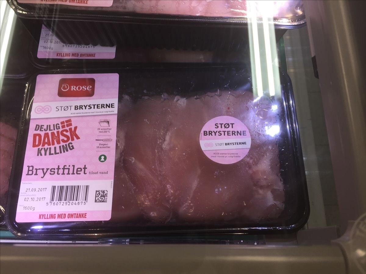 Автор: Татьяна РусубергУвидела сегодня в супермаркете "Нетто". Надпись на пачке: "Поддержите груди. Прекрасная датская курица. Грудка, филе". Это тут такая реклама фонда по борьбе с раком. Часть прибыли от продажи куриного филе идёт в фонд борьбы с раком груди.
