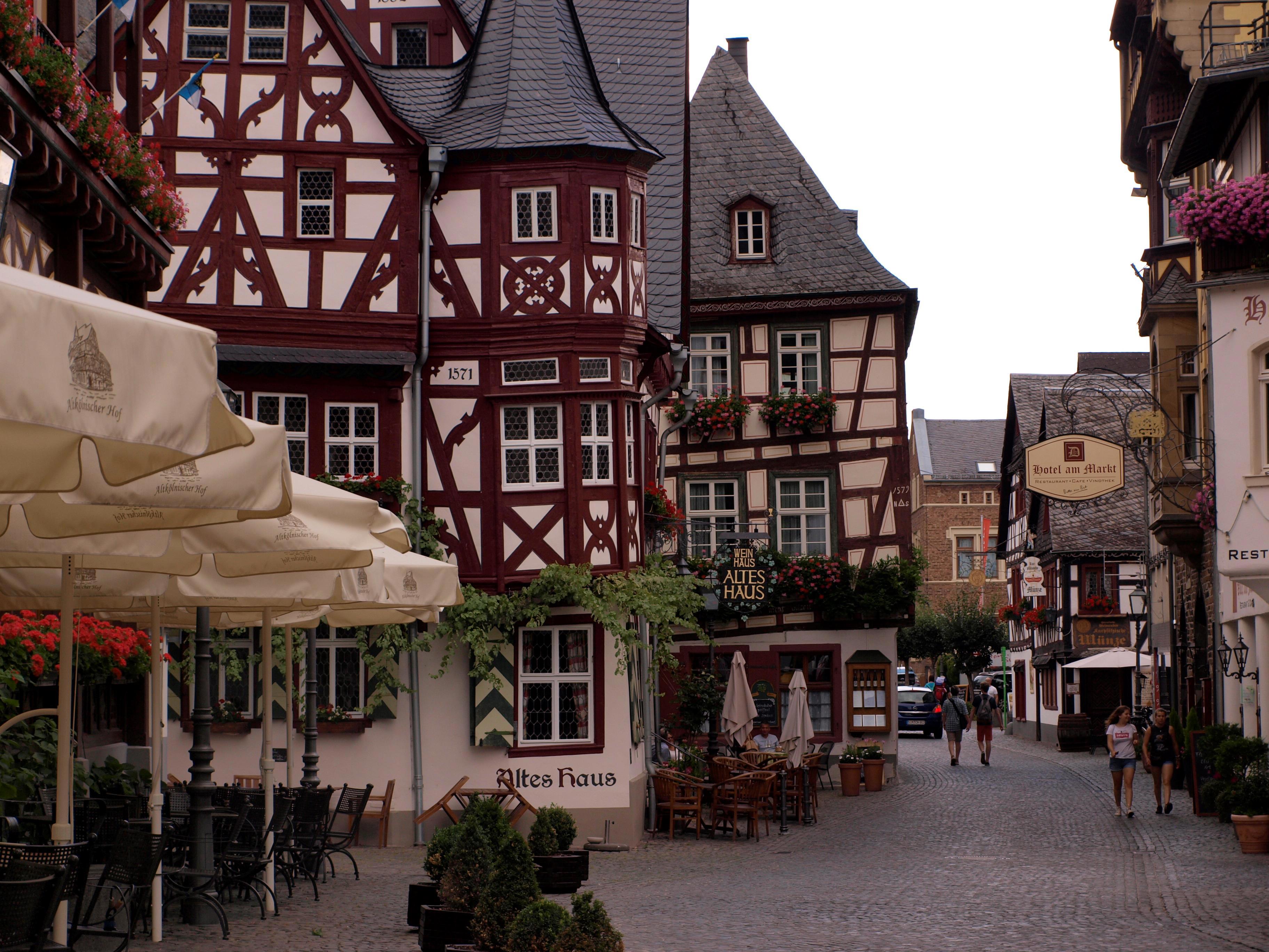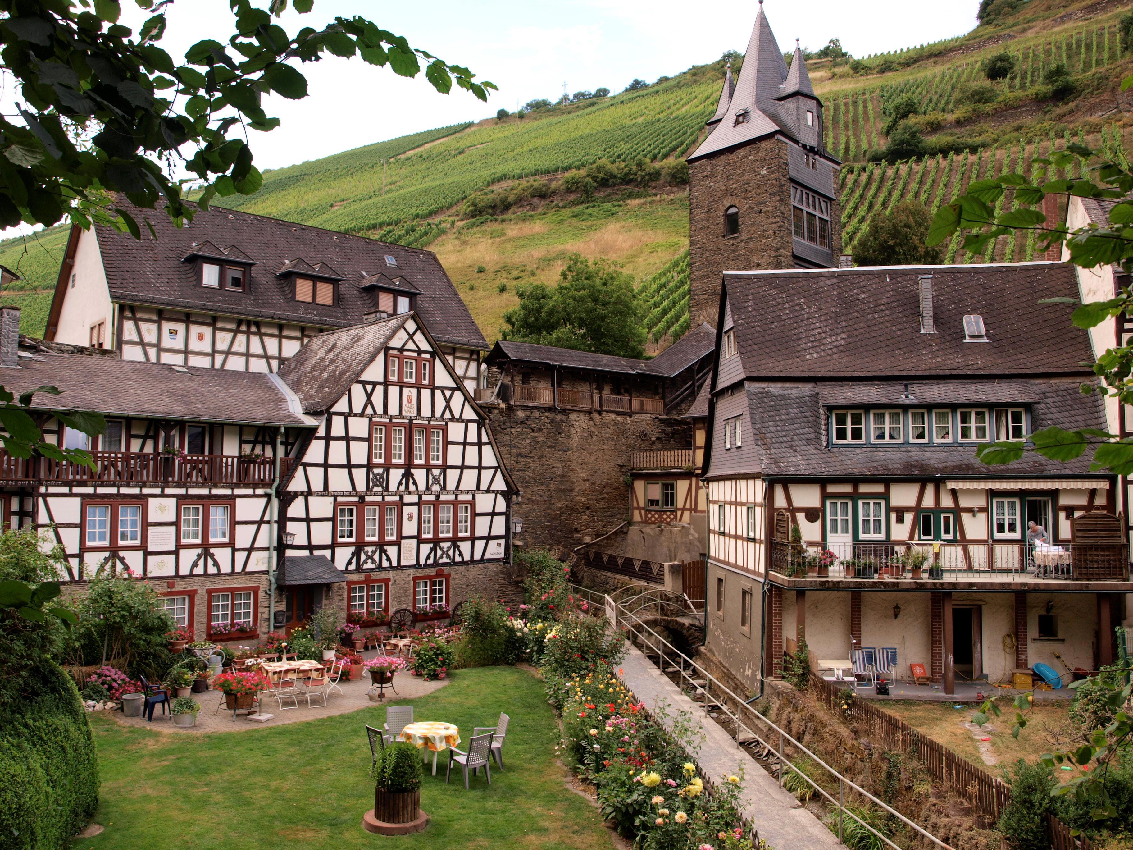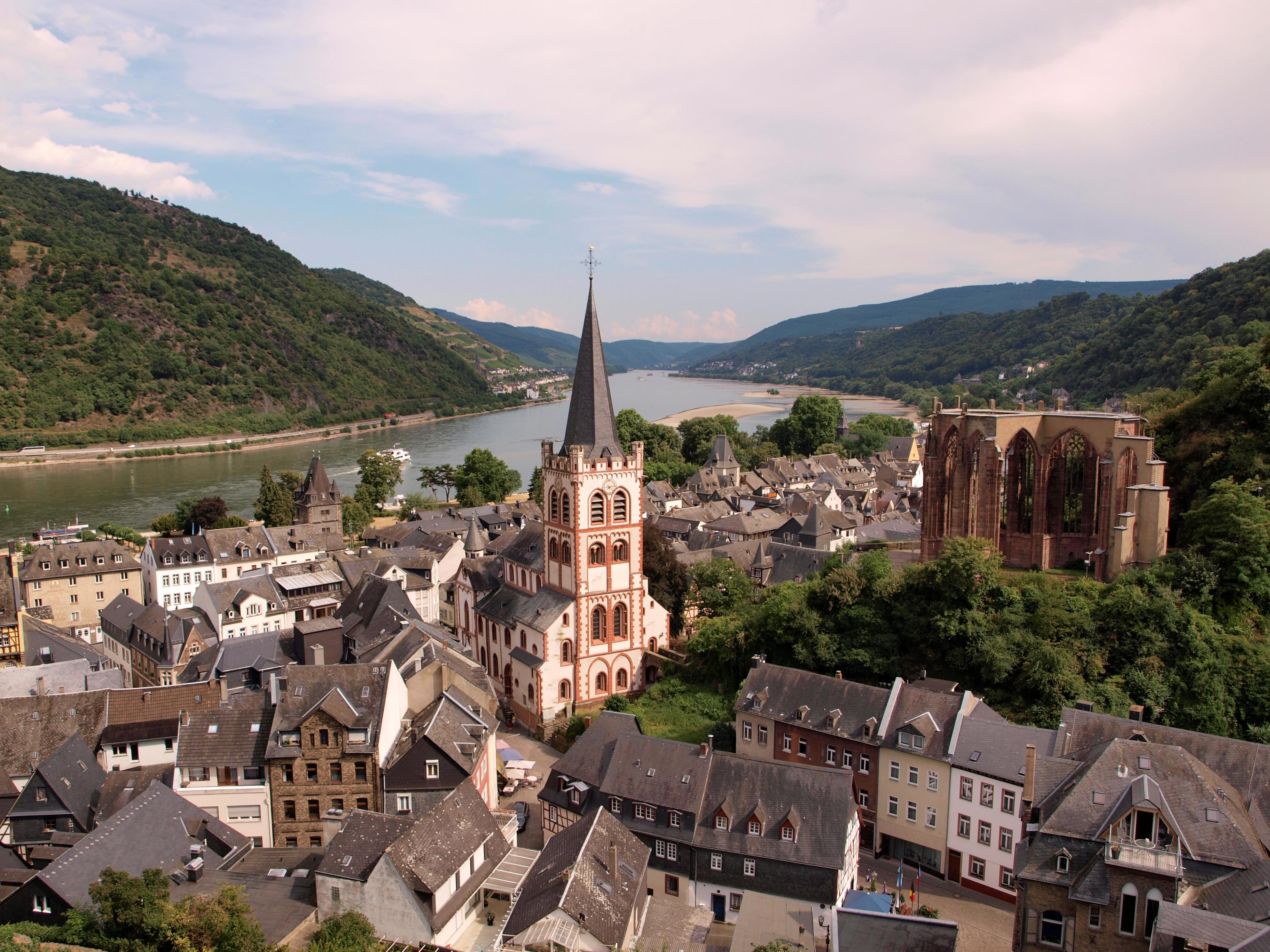 Бахарах находится в 1-1,5 часах езды от Франкфурта. В городке буквально три улицы, собор, разрушенная церковь, замок на холме, сторожевые башенки, фахверк-домики и море виноградников (здесь даже есть мороженое "рислинг" с молодым вином!). Ну и великолепный вид на Рейн с холмов.
