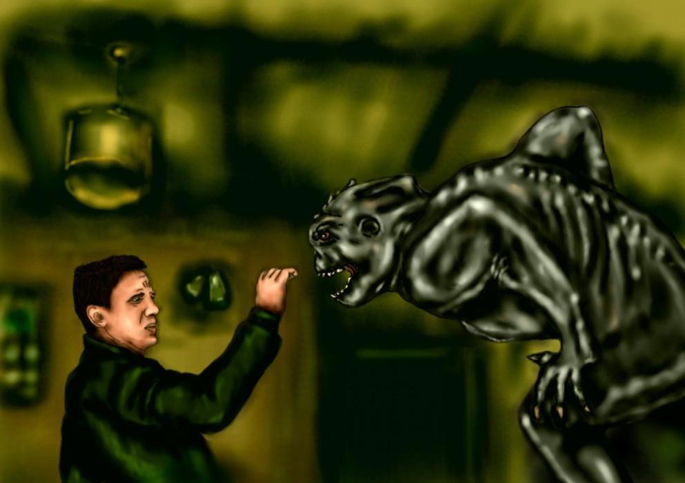 На рисунке изображён главный персонаж Алекс Гром и монстр из Мёртвого города. С ним он столкнулся, разыскивая тайник легендарной личности игрового пространства по имени Тритон.