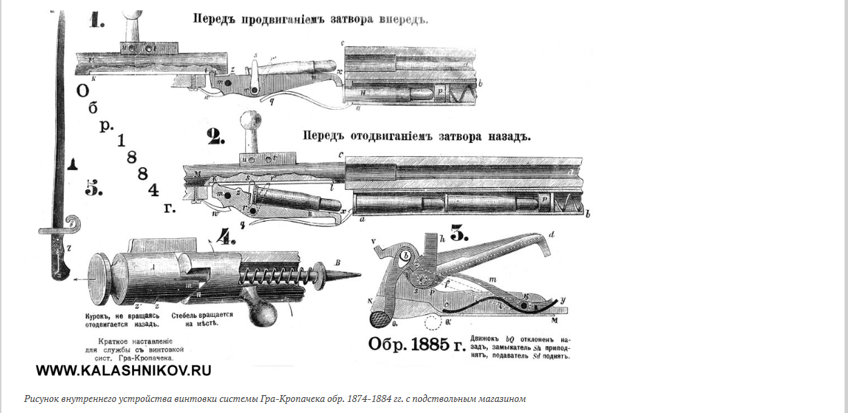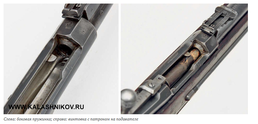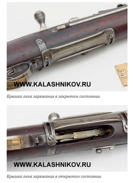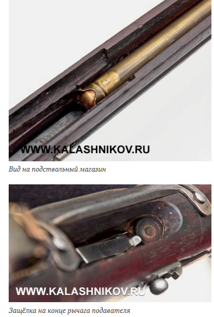 Он расположил под стволом винтовки трубчатый магазин, в пехотном варианте на девять патронов, в драгунском на семь. Стрельба могла вестись как с подачей патронов из магазина, так и при полном магазине, одиночным заряжанием с помощью отсекателя.