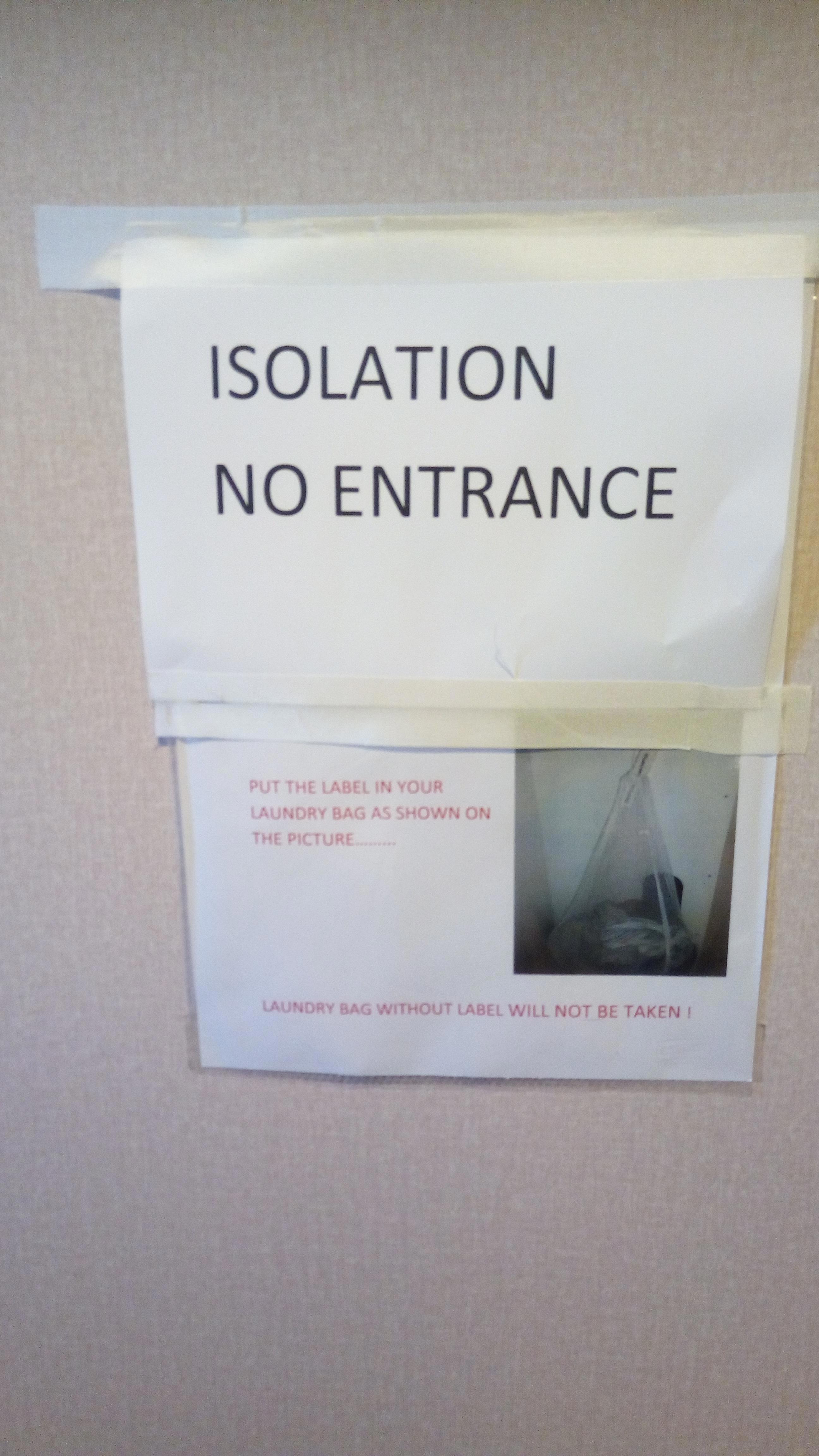 Теперь у него табличка на двери, перевод гласит: " Изоляция, не входить".