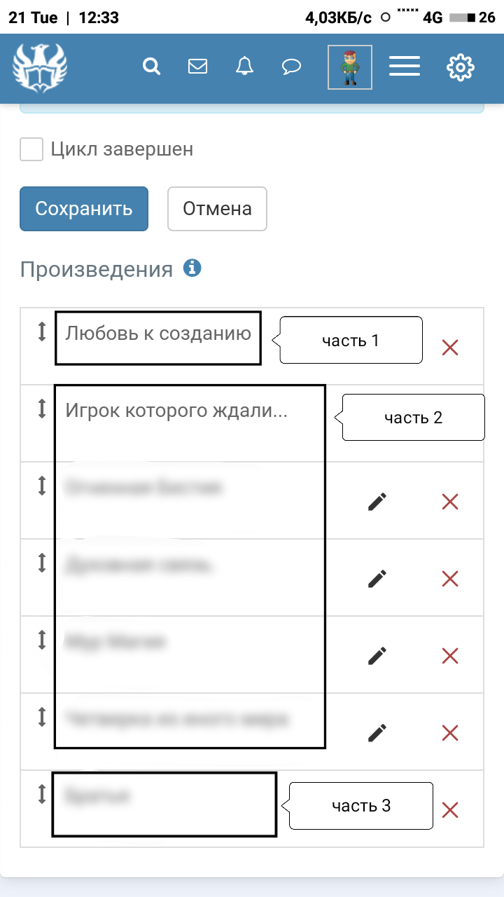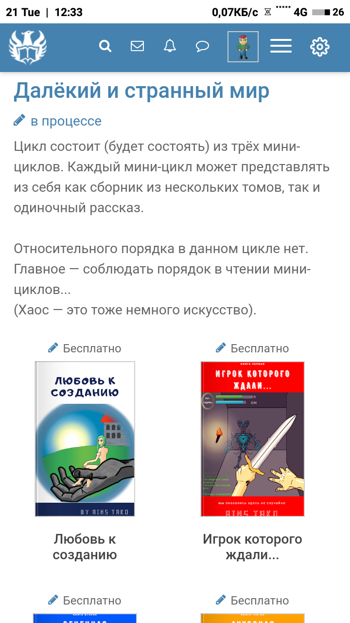 Для тех, кто вдруг не вкурсе (точнее абсолютно для всех), расскажу: Сейчас основная история, которой я занимаюсь — Цикл "Далёкий и странный мир" (потому что я сам недалёкий и мир мой тоже слегка странный). Сейчас пишется первая часть в виде отдельного романа Любовь к созданию. Потом идёт ещё две части. Вторая часть является мини циклом "Мы оказались здесь не случайно". Первая книга данного мини-цикла это Игрок которого ждали... . Вторая книга *****. О других книгах данной серии позже...