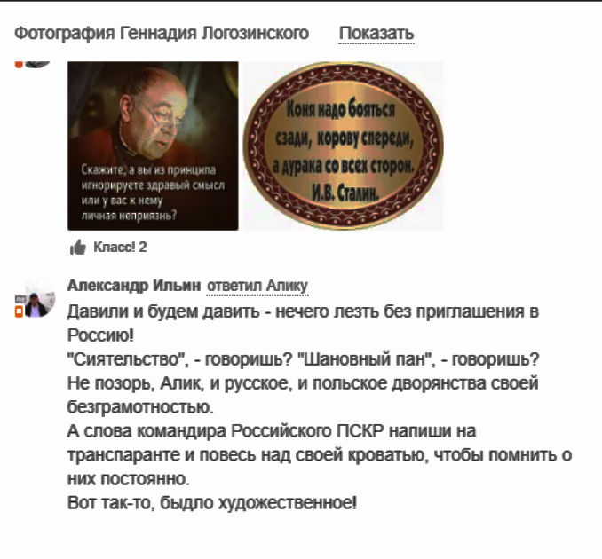 | Алексанр Ильин российский писатель, который пишет под авторским псевдонимом Питон, стоит на позиции войны. И такие есть писатели... писатели ли они? Чему в своих книгах они научат подрастающее поколение? Керченский стрелок Владислав Росляков, не на таком ли «творчестве» воспитывался? Таких людей в России хватает с избытком, Ильин отличается от них тем, что он одновременно пишет и детские сказки, и одобряет убийство украинцев: «Давили и будем давить ...» И я об этом должен помнить постоянно... |