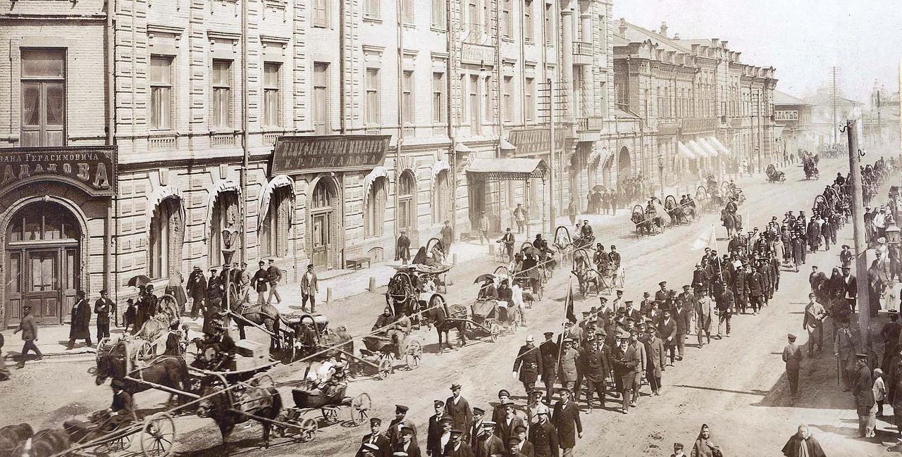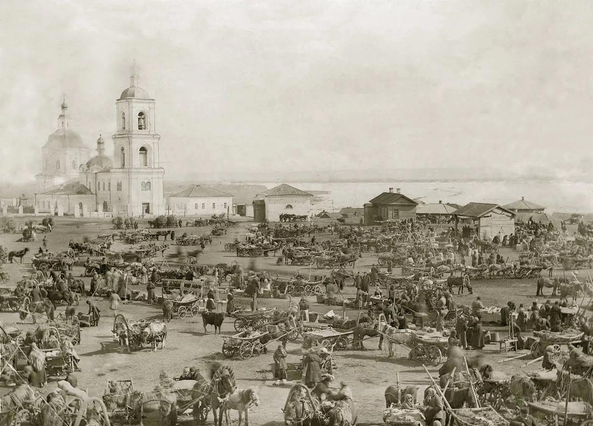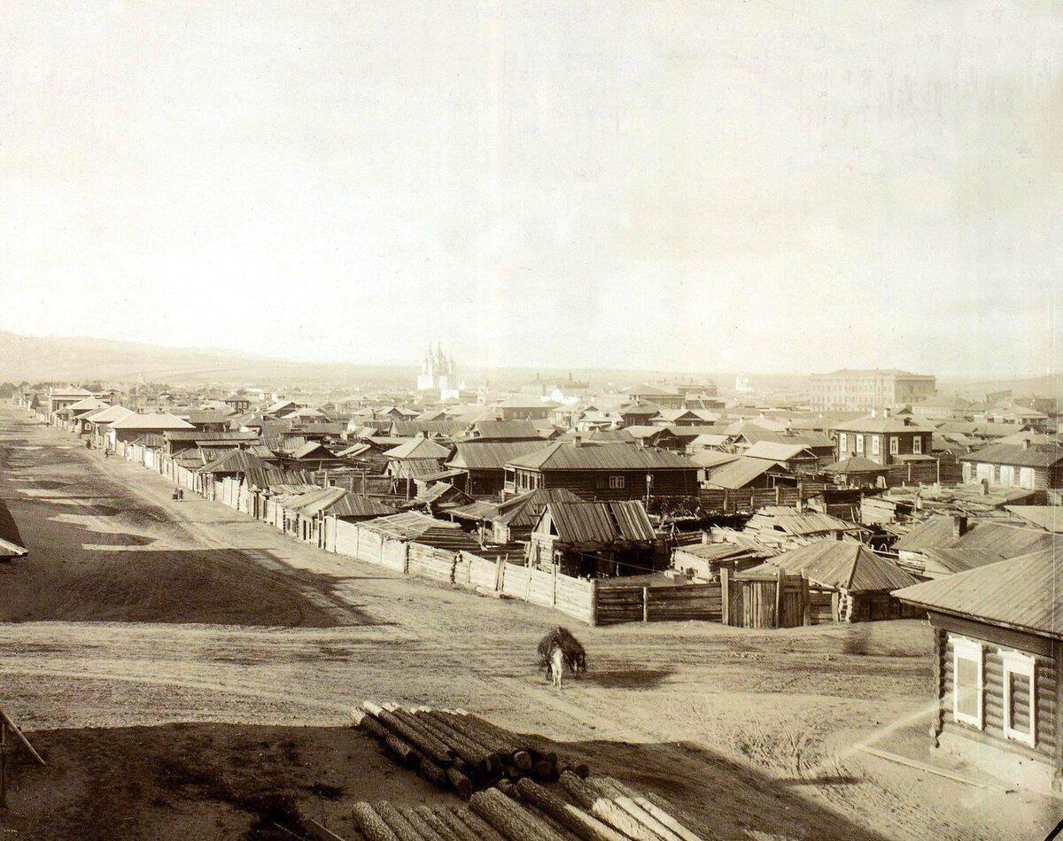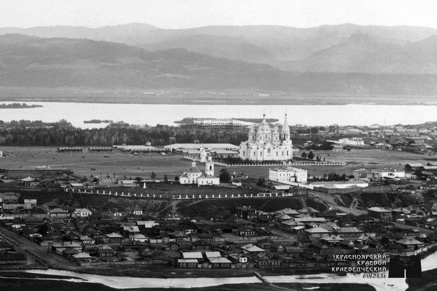 Вид на Красноярск. Собор в центре города, который был снесен после революции. Рядом центральная рыночная площадь.