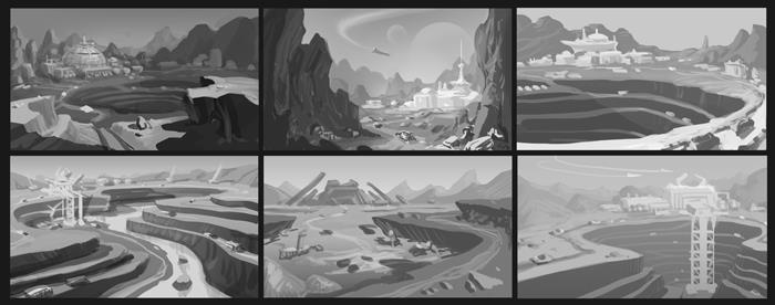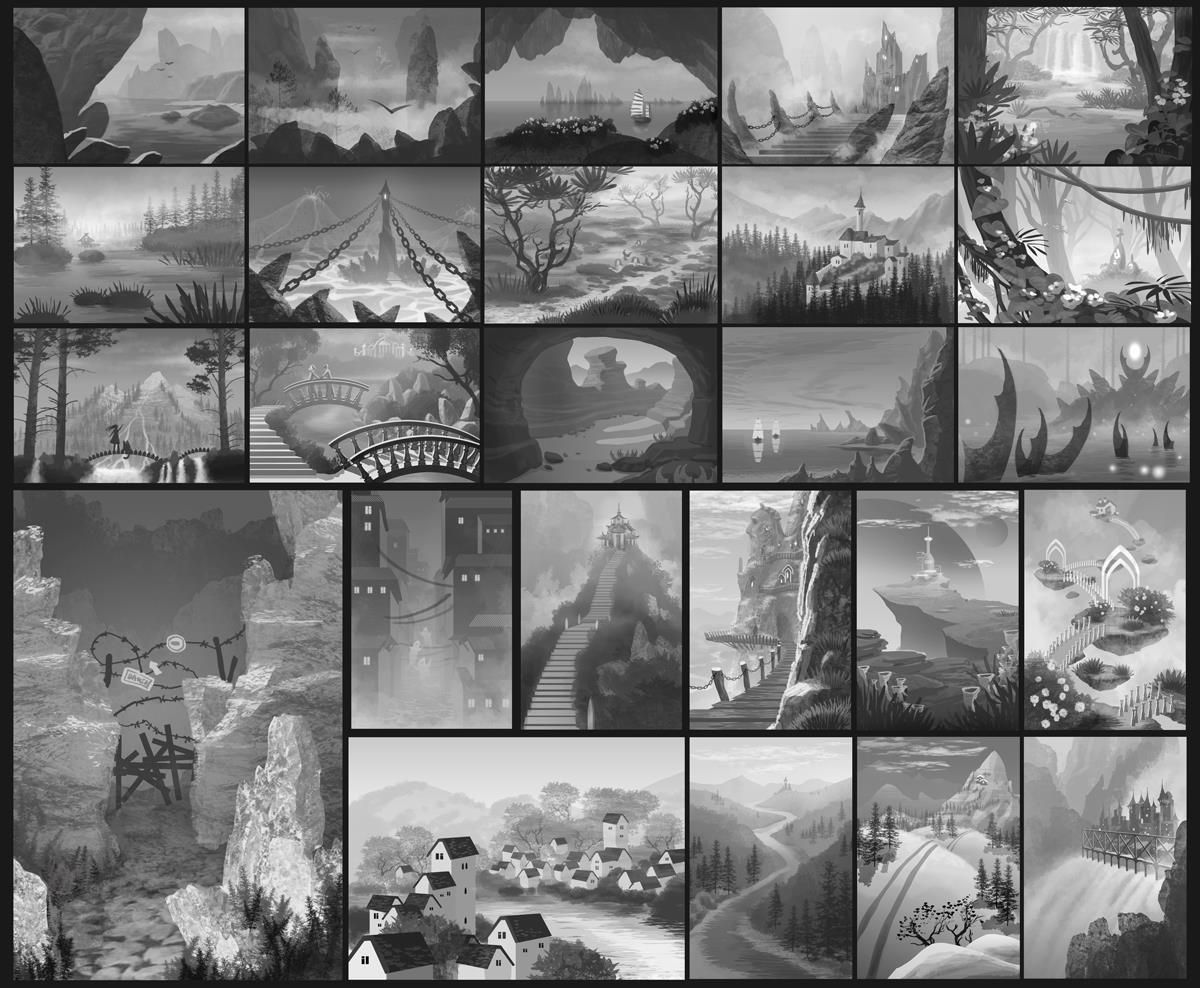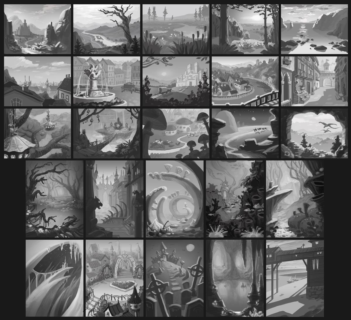Здесь задача была та же самая, но уже с использованием самодельных текстурных кистей – да, с ними всё выходит быстрее и легче, это правда. Но надо тщательно следить за тем, чтобы не превратить рисунки в детскую аппликацию-раскраску. Особая прелесть - вариативность. Увы, но факт - никто не может расставить звёзды, елочки, скалы или цветочки лучше, чем алгоритм на компьютере. (когда делаешь это вручную, всё выглядит до боли неестественно)