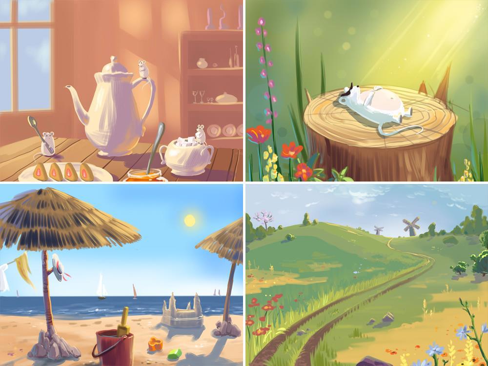 А вот этих картинок мне нужно было сделать двадцать пять за неделю – так что пришлось справляться за полчаса. Работала над композицией и плановостью.