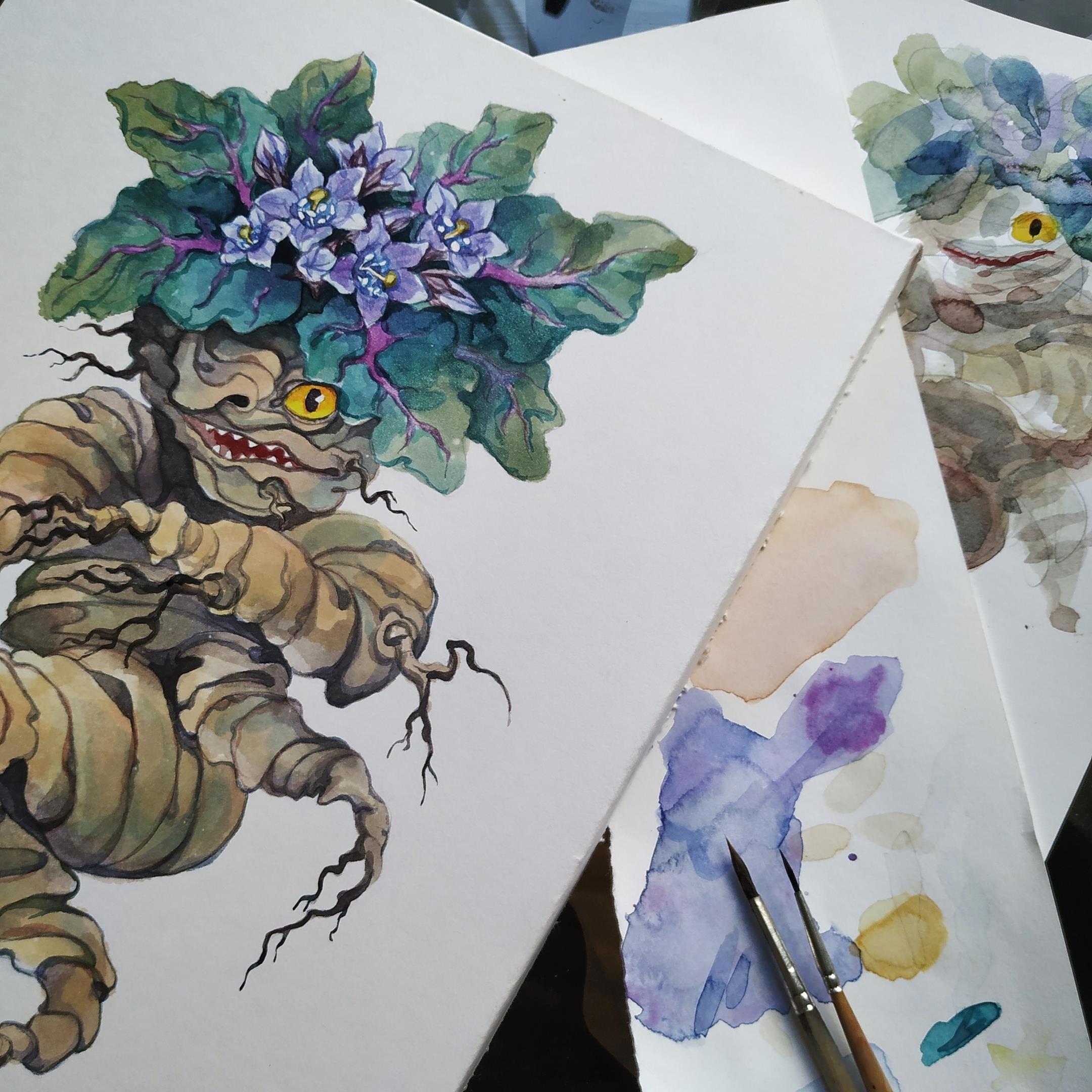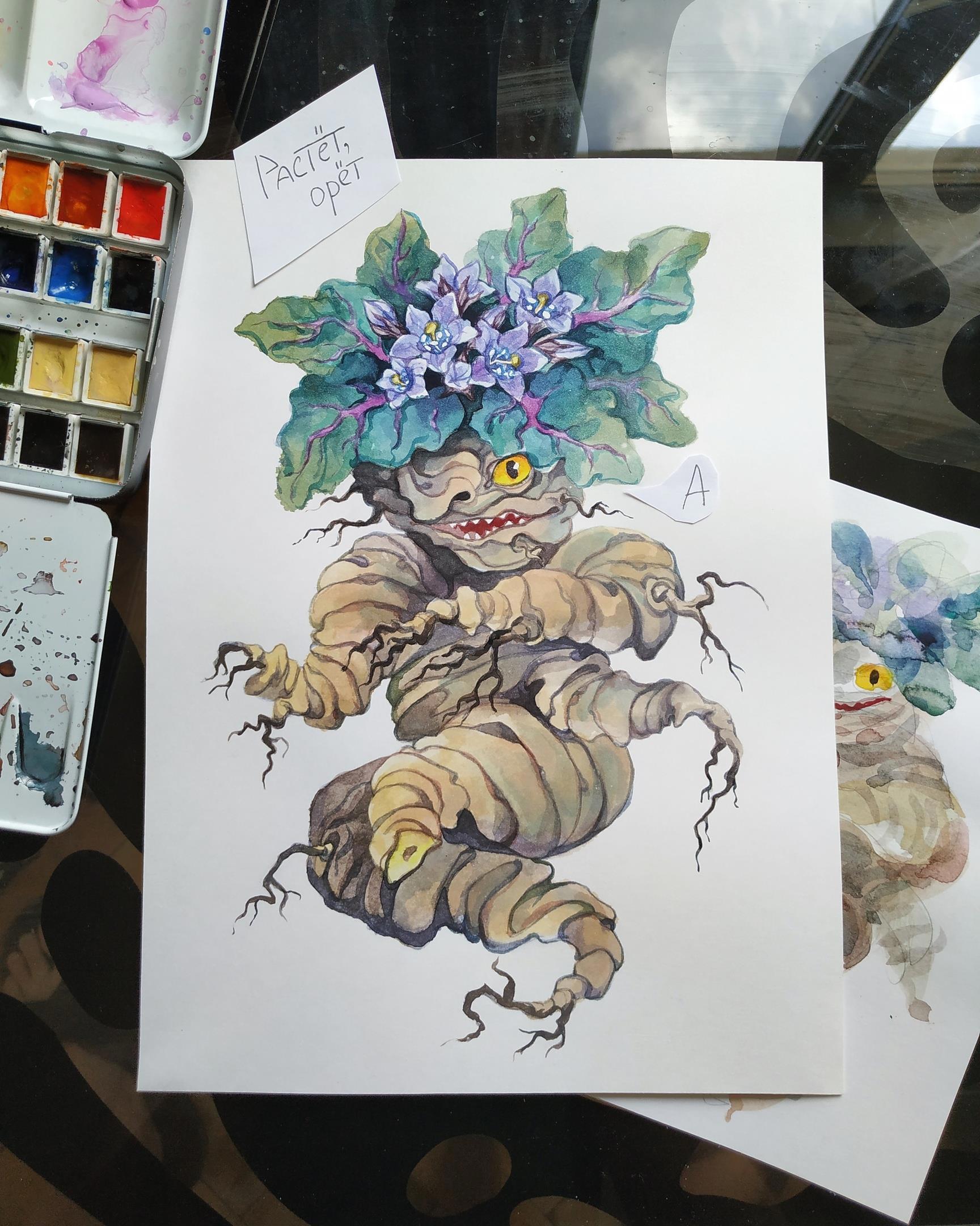 Автор: TanmornaКрайне редко доходит до того что я начинаю рисовать какие-то отвлеченные штуки, но месяц самоизоляции толкает на страшное! Например на то чтобы заказать себе несколько сортов бумаги и тестировать их на предмет совместимости с акварелью. Так появилась милашка мандрагора, готовая в случае чего не только орать, но и КУСЬ!