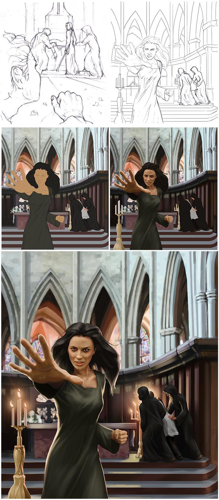 Автор: Салихов ВасильЗдесь все просто. Вместе с автором довольно быстро выбрали подходящий эскиз, она выслала давно подготовленные рефы и работа началась. Сложнее было передать разностороннее освещение. К тому же сам огонь свечей непременно должен быть с красным оттенком. Надеюсь у меня получилось.)