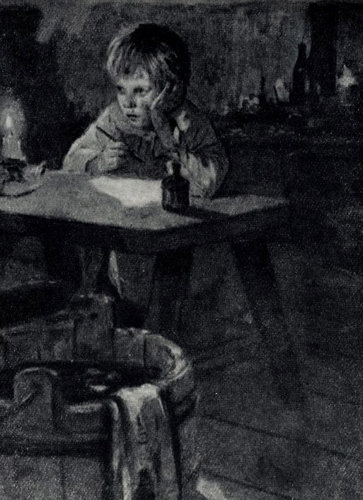 Пашка поставил блюдце на скамейку, рядом чернильницу. Опустился на колени. Он был нелеп и трогателен в своей дурацкой ушанке. Пашка вытащил из кармана фартука измятые листки, положил на скамейку, тщательно разгладил ладонями. Затем взял перо, зачем-то осмотрел кончик (муха?) и обмакнул в чернильницу...