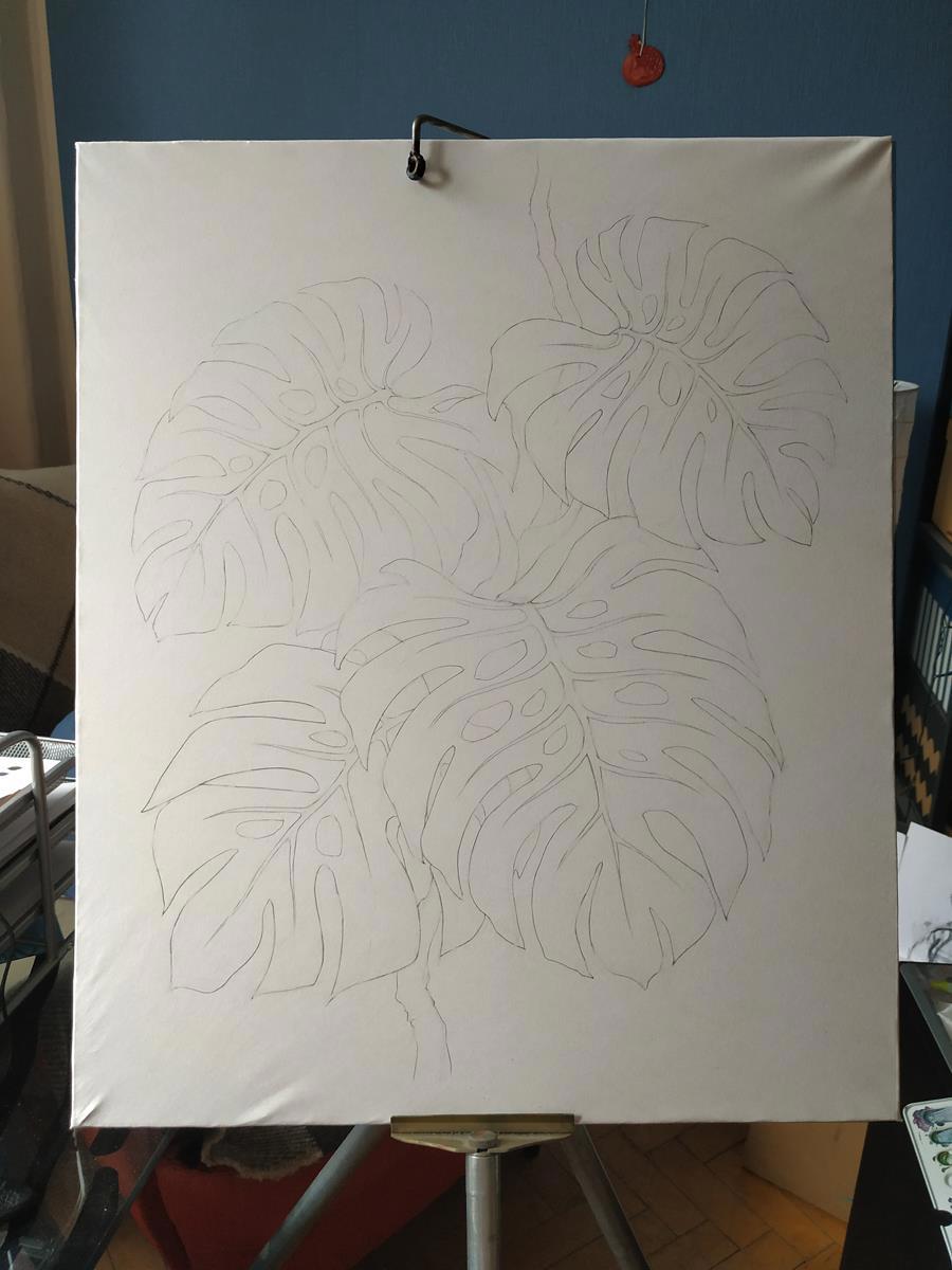 За кадром осталось только то как я натягивала планшет (будь неладны проклятые складки в углах), рассматривала фотографии листьев монстеры чтобы понять как они устроены, продумывала и набрасывала композицию, детализировала растеньичко и вычищала лишние линии чтобы акварелька легла потом на чистенькое бумажное полотнище. А так да, практически начало))