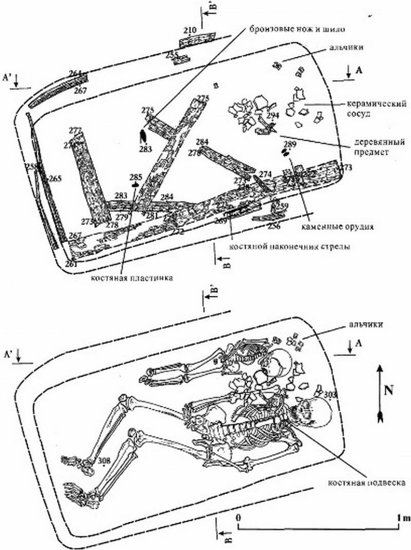 Пол могилы посыпали охрой. Покойного укладывали на спину (как правило) с согнутыми ногами. В дорогу ему клали часть туши какого-нибудь животного и оружие с инструментами. Вот так клали покойных. Это парное захоронение «Кургак» взрослого и ребёнка: