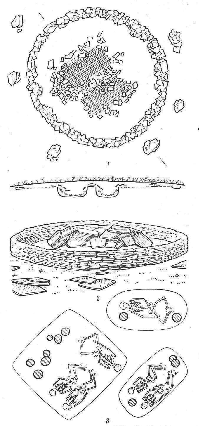 Ещё чуток фактического материала для толчка творческого процесса. Итак, типичное захоронение «афанасьевцев» выглядело снаружи как невысокий курган. Под ним скрывалась могила, выкопанная в земле круглой или прямоугольной формы. Стенки ямы облицовывались крупными каменными плитами и сверху тоже клали каменную плиту. Вот схема могильников для полноты: