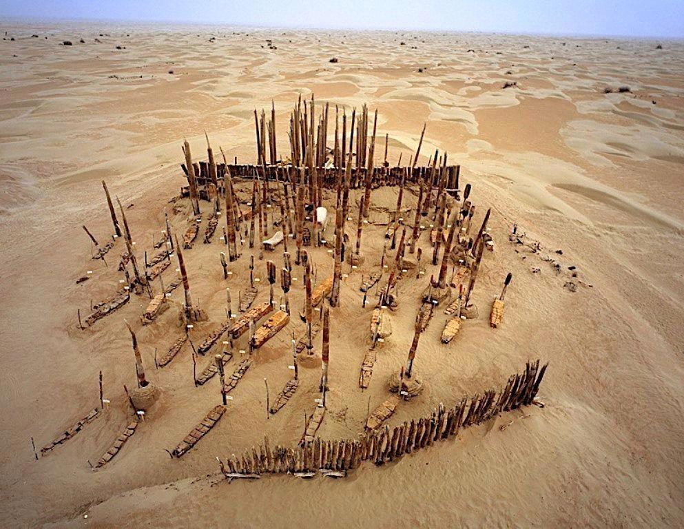 Уже сейчас заметно, что многочисленные «теории» о переселении этих народов на оглушительные расстояния большей частью просто выдумки. Причина проста – обилие захоронений одного типа на ограниченных территориях в течении длительного времени. Ещё можно отметить, что отдельные высокоорганизованные группы этих людей имели серьёзные отличия в культуре. То есть были всё же разными народами, объединёнными только расой. Вероятно, что они не всегда дружно жили между собой, хотя говорить о каком-то самоуничтожении или «взаимоослаблении» можно, только помня о том, что доказательств этой версии нет совсем. Действительно – бугровики так долго и хорошо зарабатывали своими лопатами именно потому, что подавляющее большинство курганов разграбленными не были. Если бы хозяев этих погребений разбили бы враги, то первое, что они бы сделали – разорили святыни побеждённых, заодно набив карманы. То есть процессы происходили достаточно мирно и в пределах одной семьи. Хозяйственный упадок вполне мог быть вызван изменением климата. Очень показательная фотография. Посмотрите – это кладбище Сяохе тех самых «псевдотохар», которые к самим тохарам никаким боком не относятся: