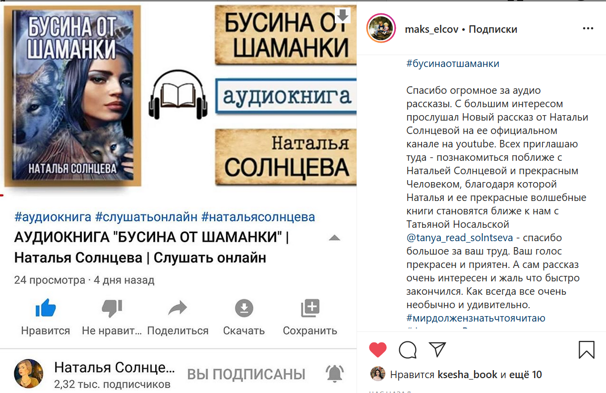 "Спасибо огромное за аудио рассказы. С большим интересом прослушал новый рассказ от Натальи Солнцевой на ее официальном канале на youtube. Всех приглашаю туда - познакомиться поближе с Натальей Солнцевой и прекрасным Человеком, благодаря которой Наталья и ее прекрасные волшебные книги становятся ближе к нам, с Татьяной Носальской - спасибо большое за ваш труд. Ваш голос прекрасен и приятен. А сам рассказ очень интересен и жаль что быстро закончился. Как всегда все очень необычно и удивительно".