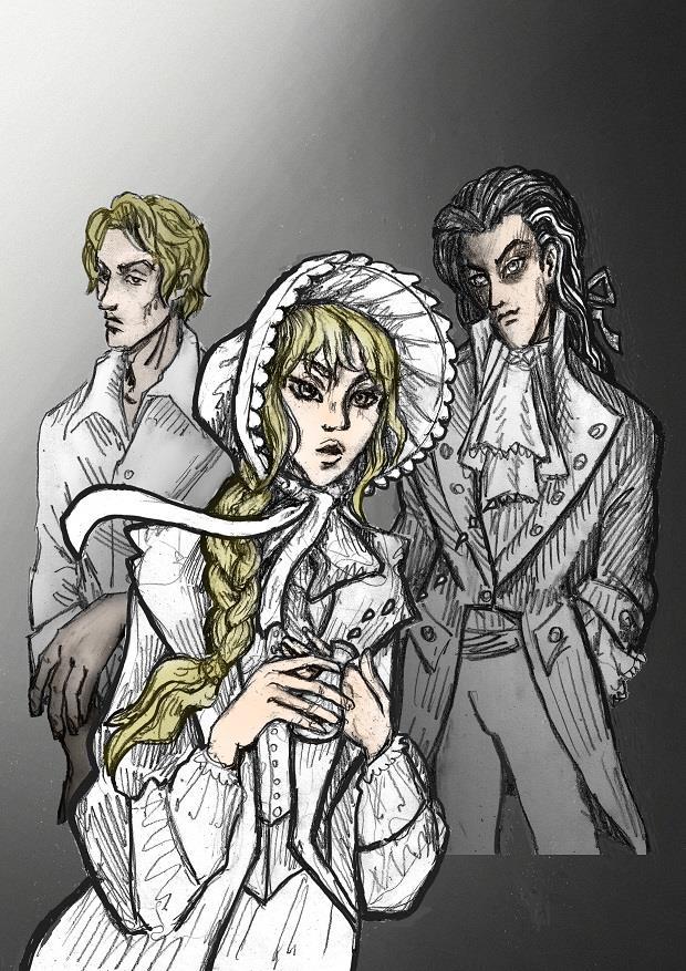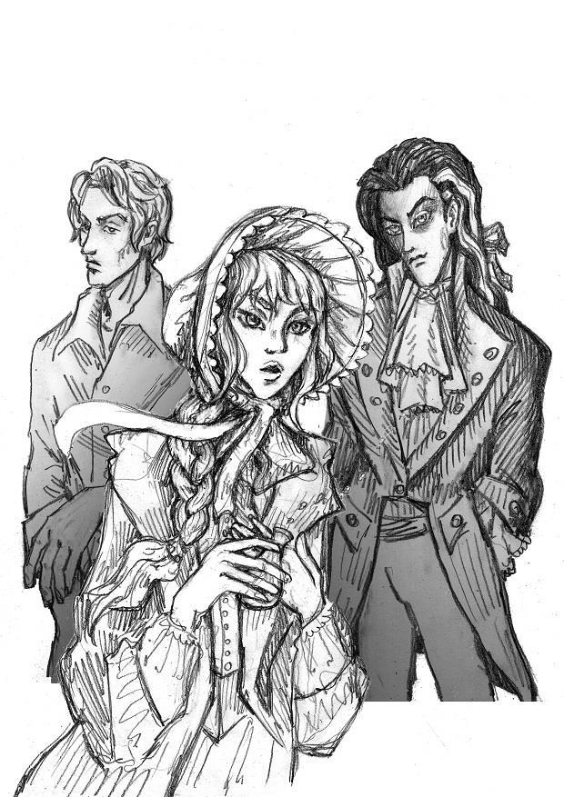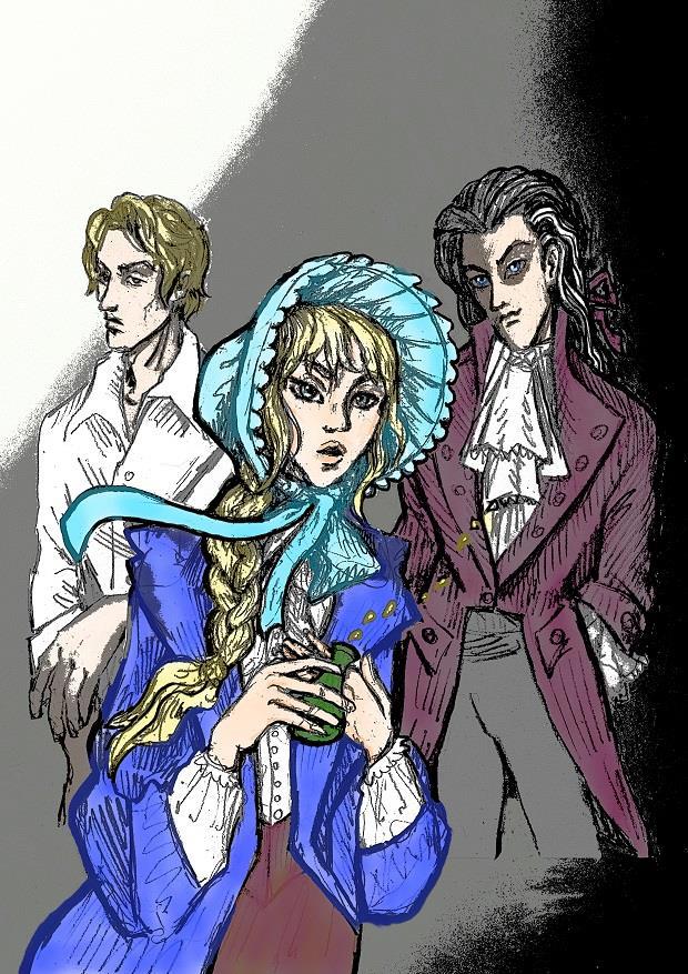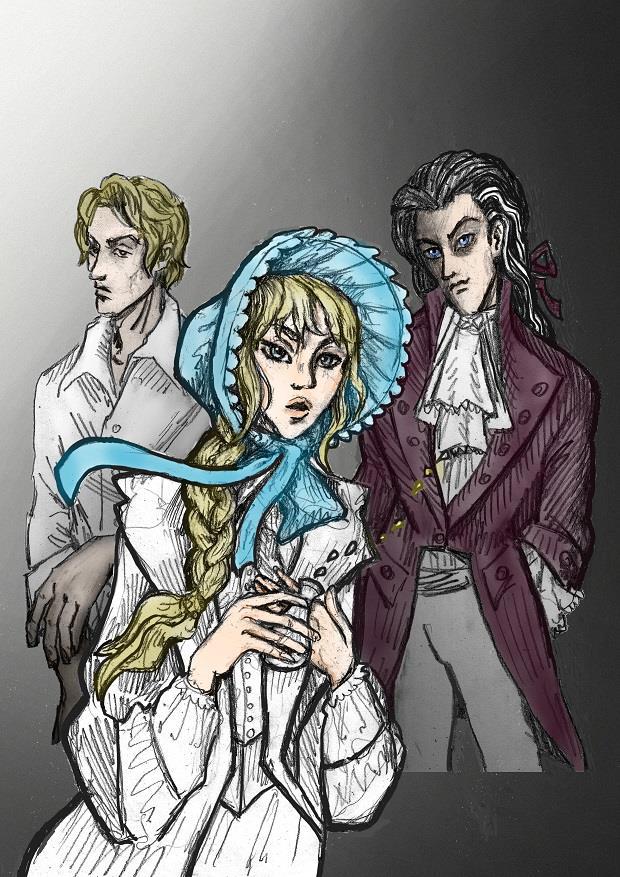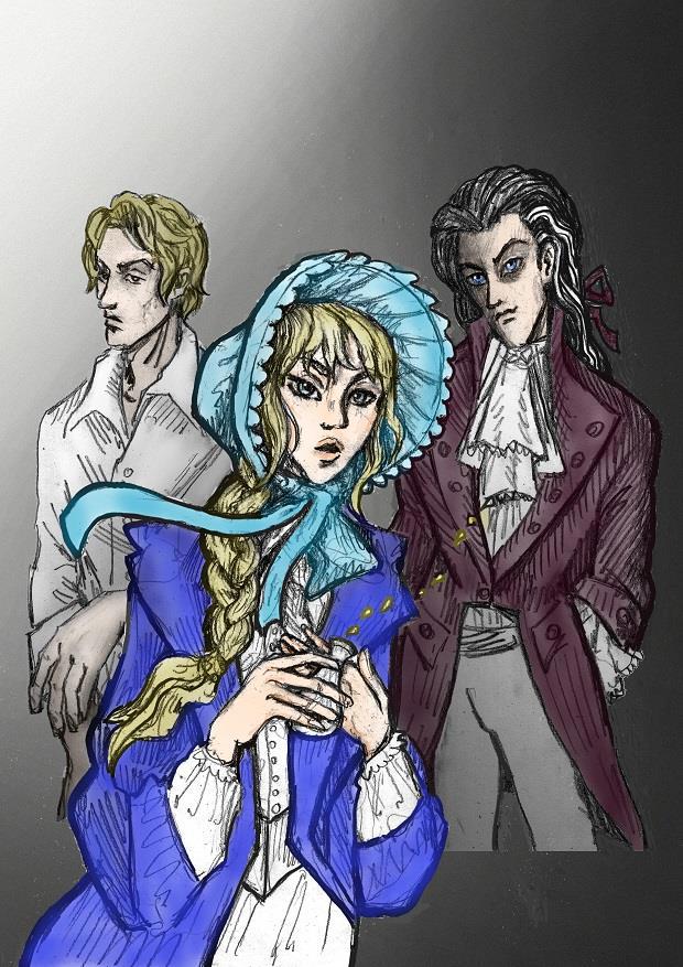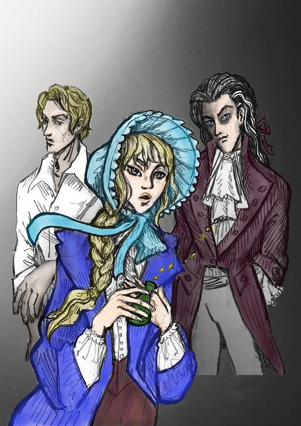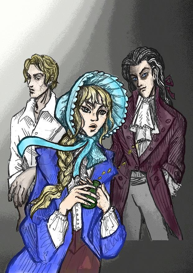Голубой капор и глаза у девушки и синие глаза у Сибора + загладила ему и Леху лицо от грубой штриховки и чуть навела подрумянца на щёчки, губы и руки Капы: