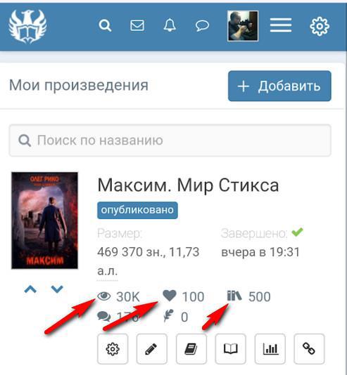 Зато после выкладки книги полностью тут же получился прикольные результат: 30К просмотров, 100 лайков и 500 добавлений в библиотеку