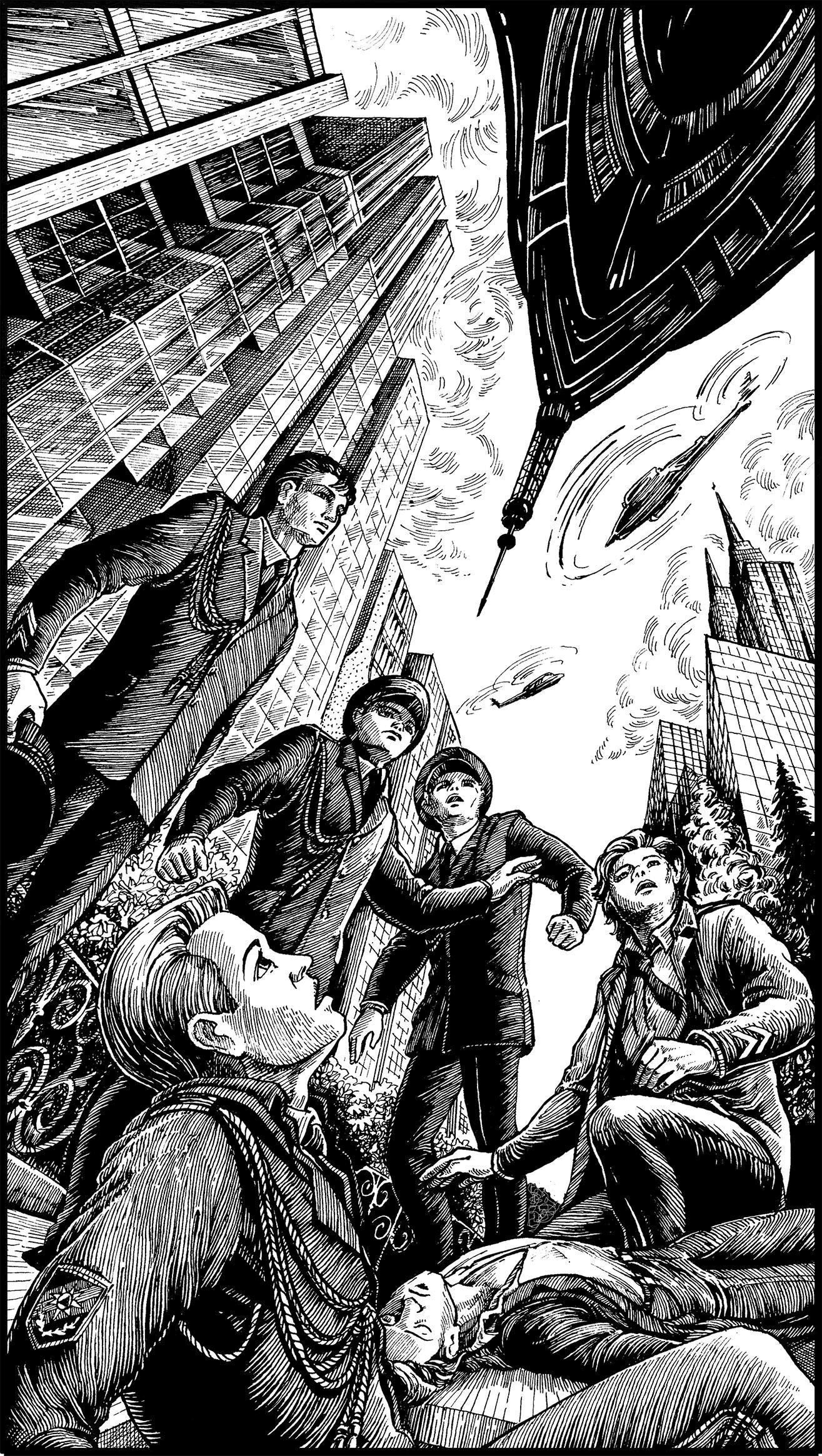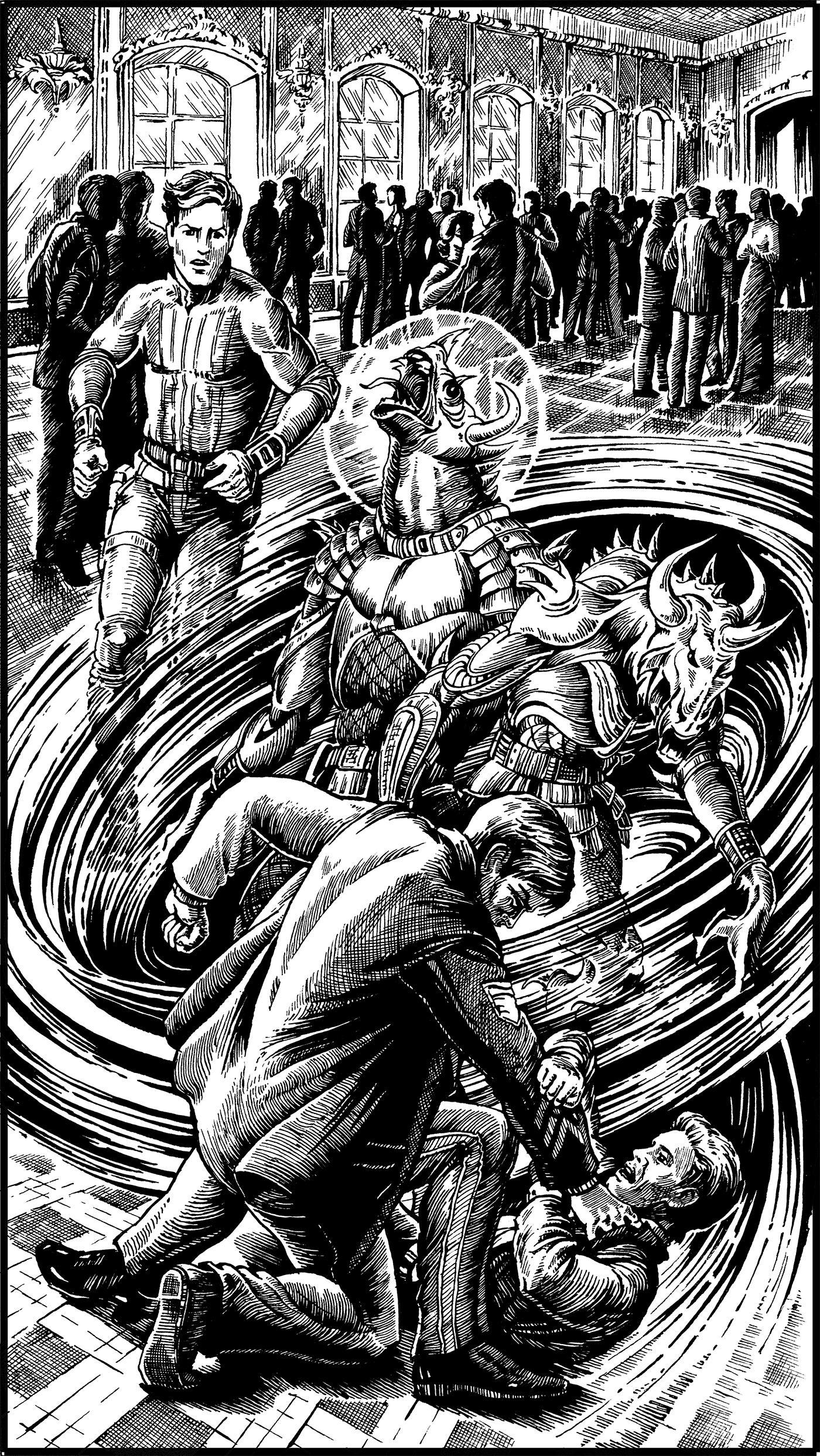 На первом плане с оружием – ксенопсихолог Шайтан; он не левша, как нарисовано, однако такого расположения требовала композиция рисунка. :)