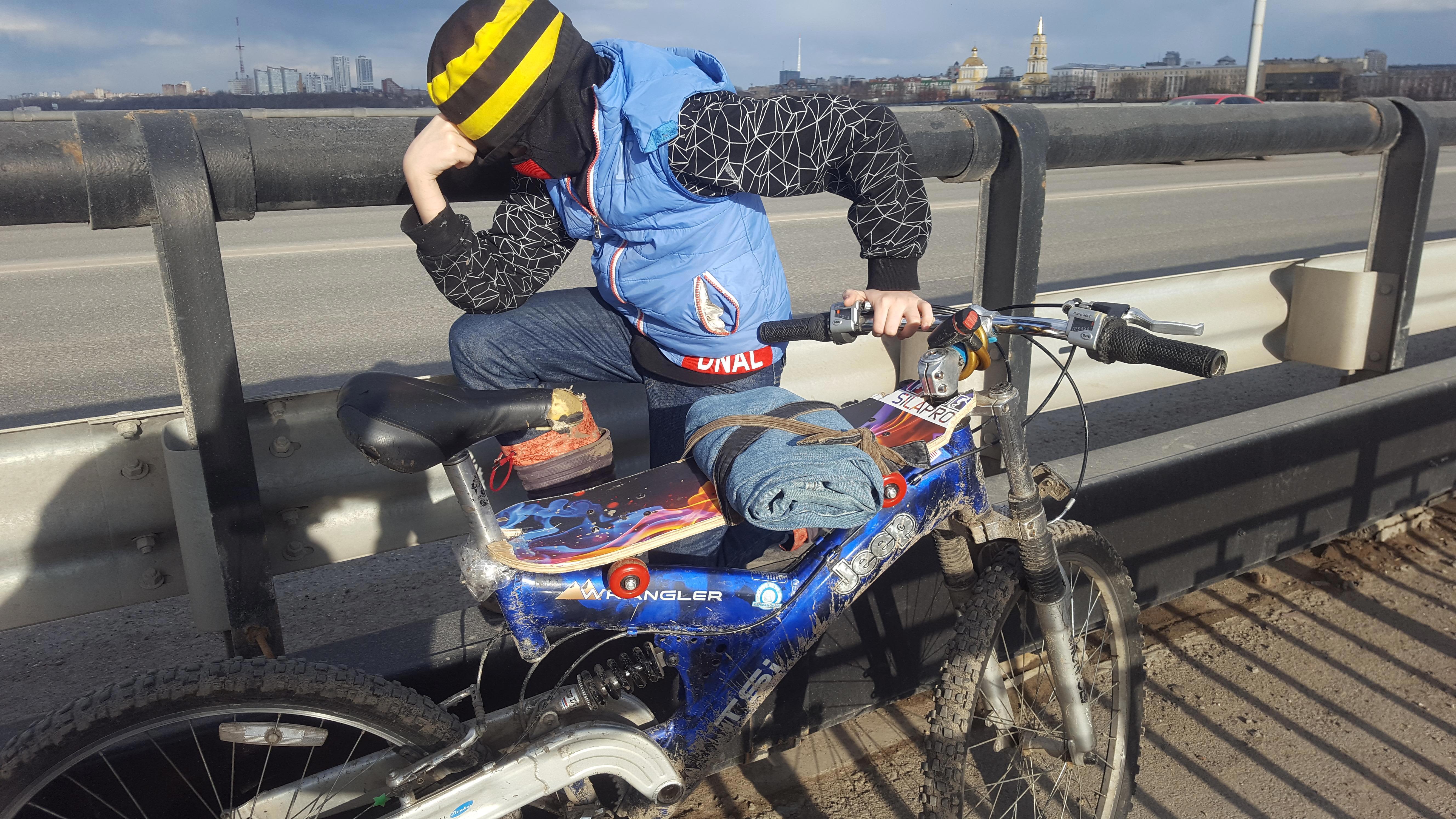 Пересиживать самоизоляцию в Перми приятнее чем в МСК --- на расстоянии 15 минут у меня дикий лес и берег реки. Чтоб добираться туда с сыном соорудил этот продукт высоких технологий.