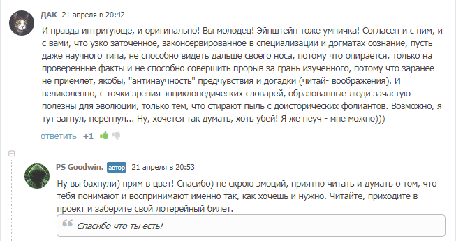Этот чуДАК человек первым отреагировал на мою книгу, размещённую здесь и наградил "вдохновлённым пенделем" "моё творчество")) за что я искренне тебе благодарен!