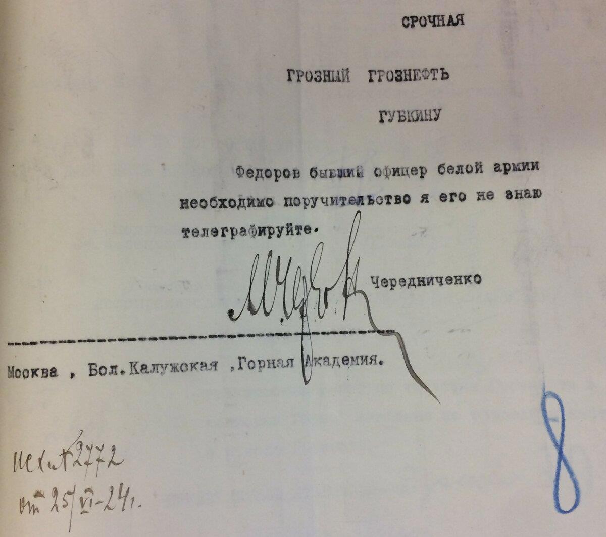 25 июня 1924 года начальник административно-хозяйственного управления Мирон Чередниченко отправляет телеграмму в Грозный ректору Московской горной академии, знаменитому академику Ивану Губкину: «ФЕДОРОВ БЫВШИЙ ОФИЦЕР БЕЛОЙ АРМИИ НЕОБХОДИМО ПОРУЧИТЕЛЬСТВО Я ЕГО НЕ ЗНАЮ ТЕЛЕГРАФИРУЙТЕ».