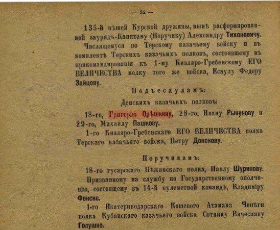 Как и Лобик, всю войну прошел на переднем крае. Воевал не менее геройски, и по количеству полученных орденов Орешкин если и уступал товарищу, то незначительно — пять вместо шести: Станислав III и II степени, Анна IV (Аннинское оружие «за храбрость») и III степени, орден Святого Равноапостольного Князя Владимира IV-й степени с мечами и бантом.