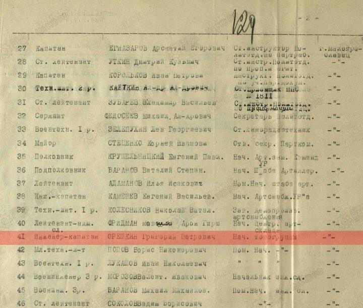 Его фамилия вновь появляется в документах времен Великой Отечественной войны. Причем в личном деле Орешкина фигурирует примечательная фраза: "1889 года рождения. В РККА с 1941 года. Место призыва: Бауманский райвоенкомат, Московская обл., г. Москва, Бауманский р-н".