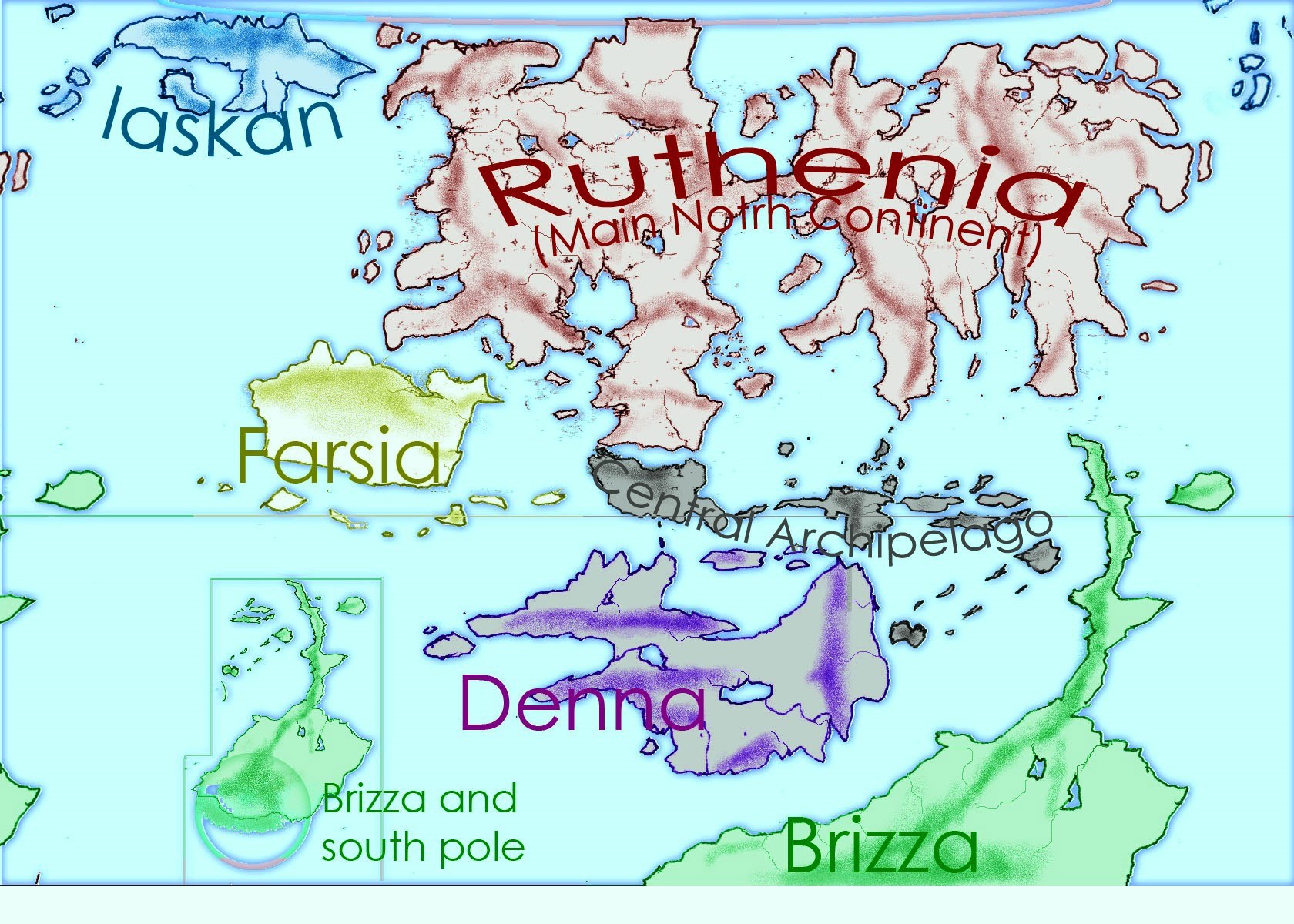 Государства – Бриззская Империя (или просто Бризза, 55 млн человек), Западная Санта-Бризза, колонии Экваториальная Бризза (Амирлания), Скалистая Бризза (Рутения), Полярная Бризза (спорное между Бриззкой Империей, Иасканом и Амирланией). Климат – от тропического (на Великом Полуострове) до арктического в районе южного полюса. Единственный континент с постоянным снежным покровом (в районе полюса).
