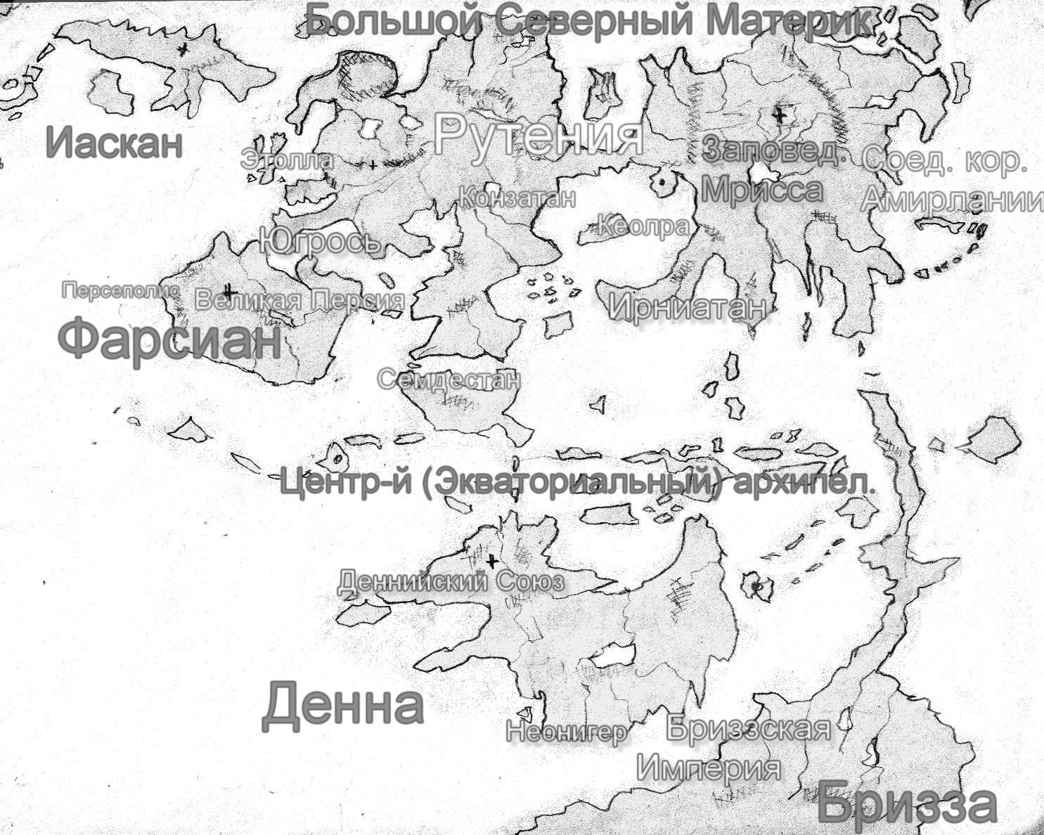 Большой (Экваториальный) Архипелаг – 4,2 млн. кв.км, общее население – 18 млн. чел. Независимых признанных государств нет, полностью состоит из колоний и островных территорий Амирлании, Рутении, Бриззской Империи, Иаскана и Ирниатана. Население также смешанное, представлены потомки переселенцев всех возможных директорий Рутеи. Периодически возникающие бунты и независимости на островах либо жестоко подавляются (Амирлания, Бризза), либо используются в геополитических целей для распространения влияния (Рутения, Иаскан, Ирниатан).
