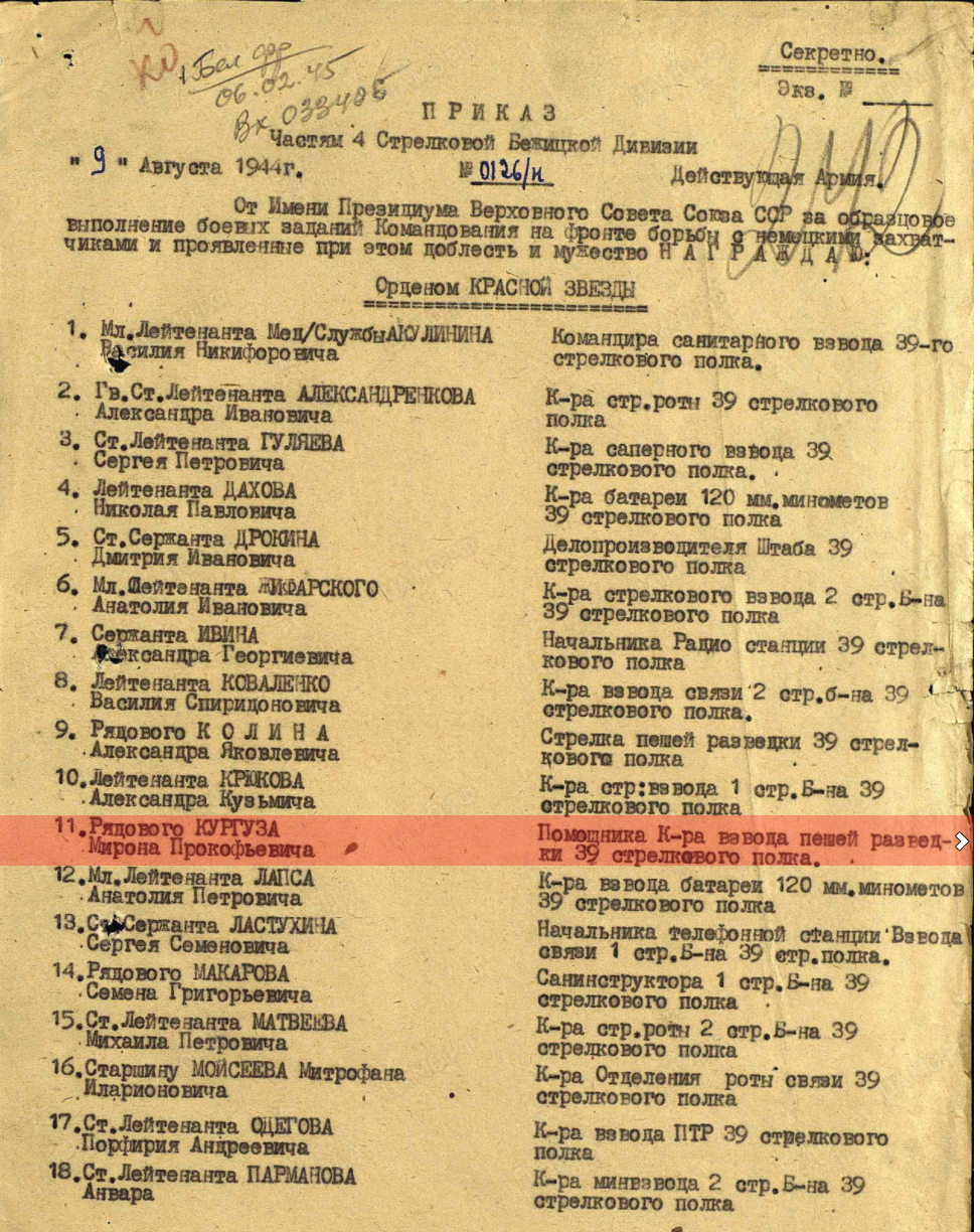Звали моего прадеда Кургуз Мирон Прокофьевич и родился он в далеком 1908 году, а умер в 1976 году. По словам матери он был очень строгим человеком, если обычно бабушки и дедушки любят посюскать с внуками, то ее дед, мой прадед, был не таким. Он всегда говорил только по делу, любил покомандовать, хвалил очень редко и любил указывать на различные ошибки. Про войну он практически никогда не говорил, стоило зайти разговору о войне и он сразу замолкал и уходил.