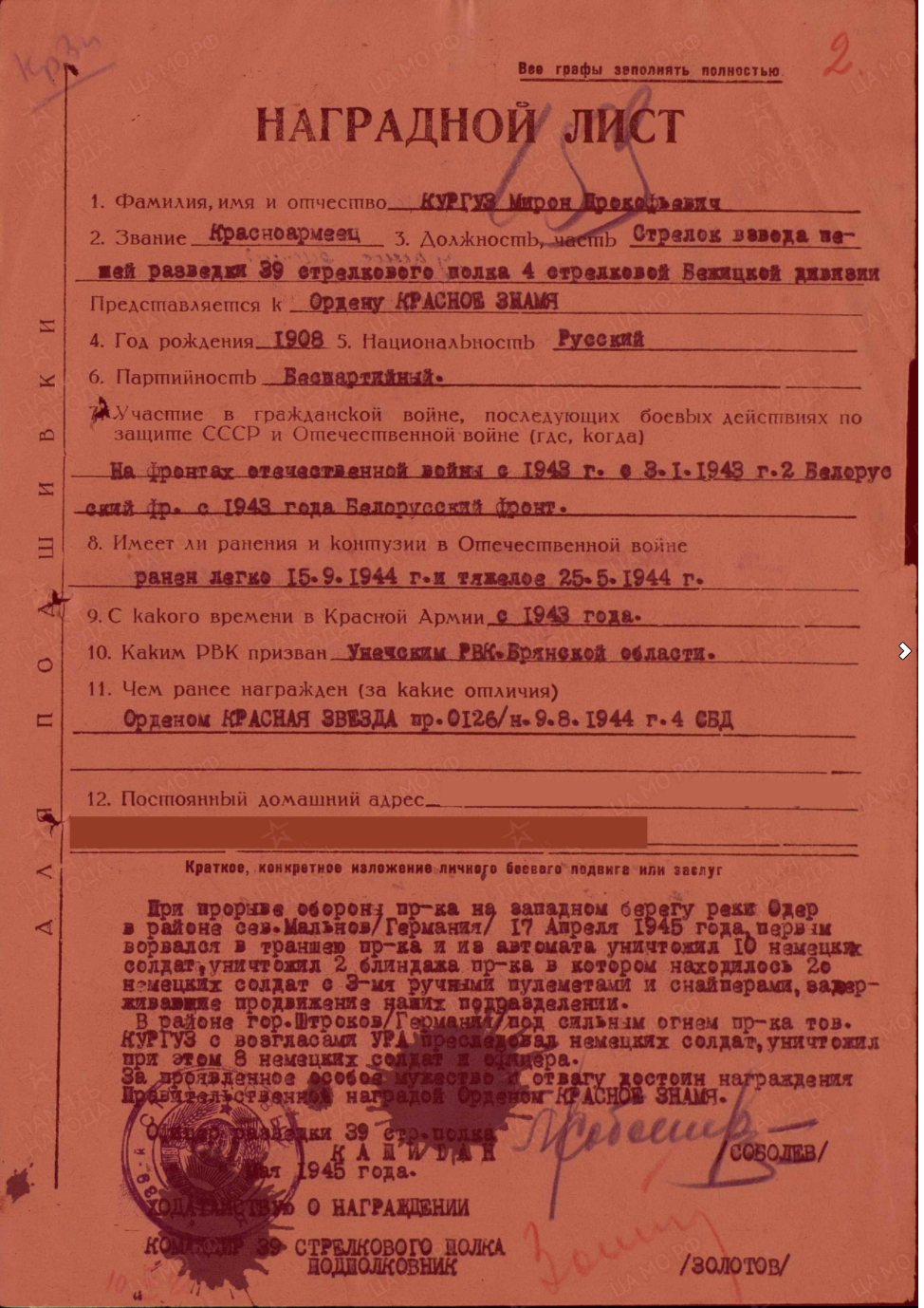 Вторую награду мой прадед получил уже в 1945 году