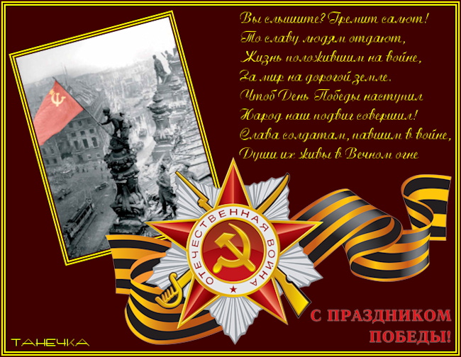 Поздравляем вас с великим праздником – 9 мая! Много лет прошло с того дня, когда впервые прозвучало это слово – "Победа". 9 мая – это светлый и радостный праздник. В этот день 75 лет назад закончилась Великая Отечественная война. Мы с благодарностью вспоминаем воинов, отстоявших мир. Всем нашим защитникам мы обязаны тем, что живём сейчас под мирным, чистым небом. ВЕЧНАЯ ИМ СЛАВА!