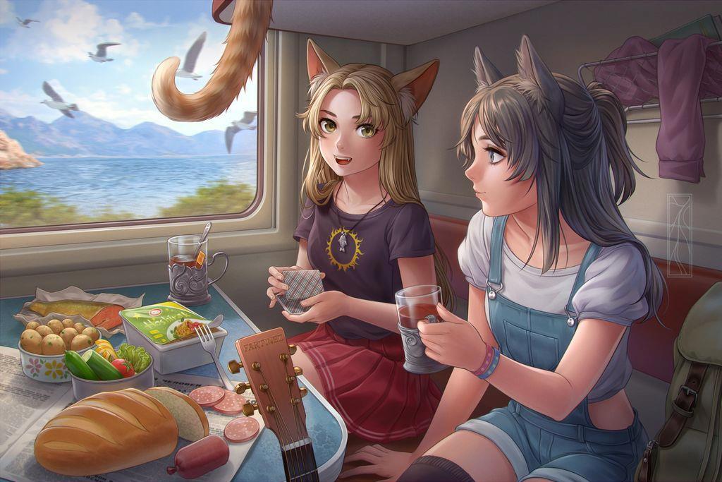 Открыв дверь в купе я удивился: на газете лежали батон и колбаса, стояли эмалированные чашки со свежими огурчиками и варёной картошечкой, с этим соседствовал вполне современный дошик. За столом пили чай две весёлые девушки с ободками "а-ля кошачьи уши" на головах, с верхней полки болтался какой-то рыжий шарфик. Из вежливости я не стал их пристально рассматривать, лишь поздоровался и сел напротив.