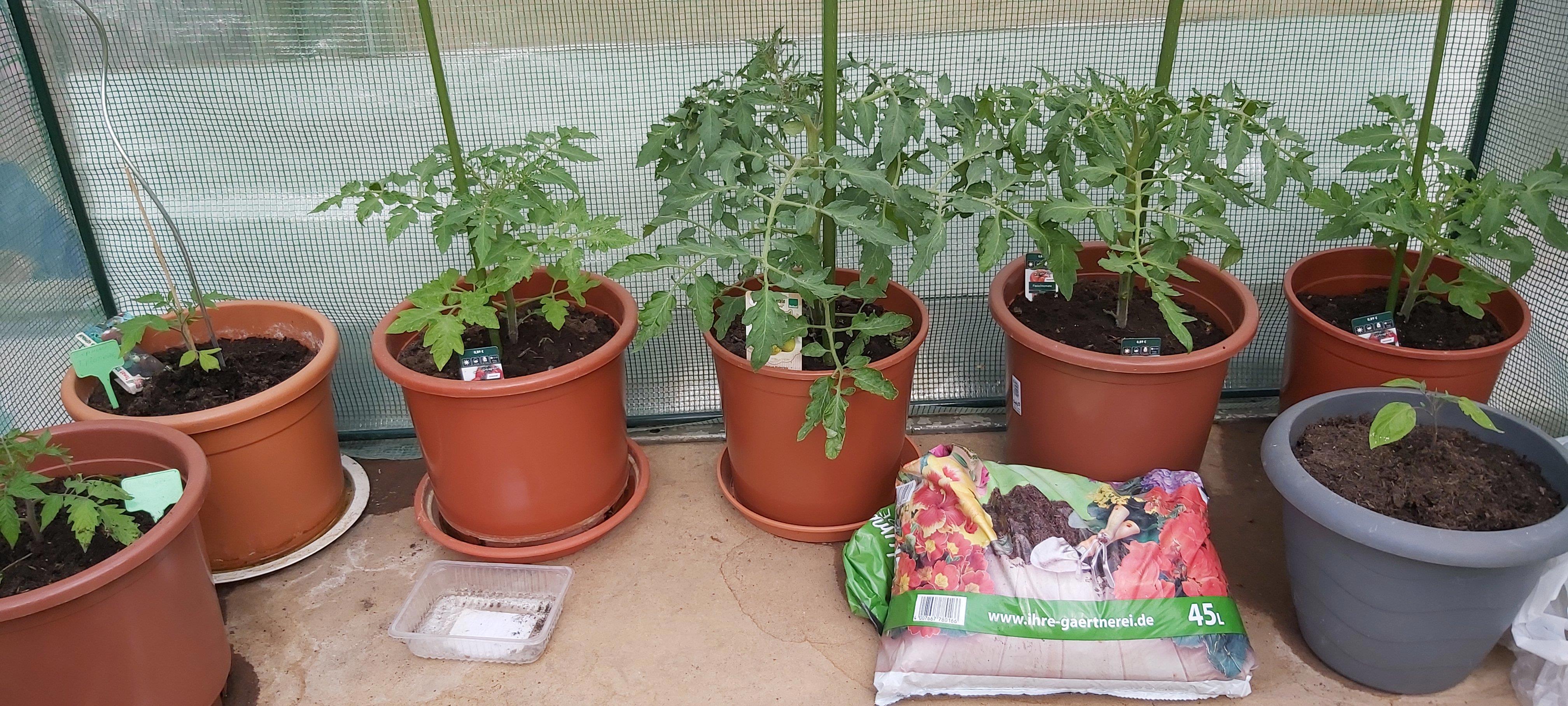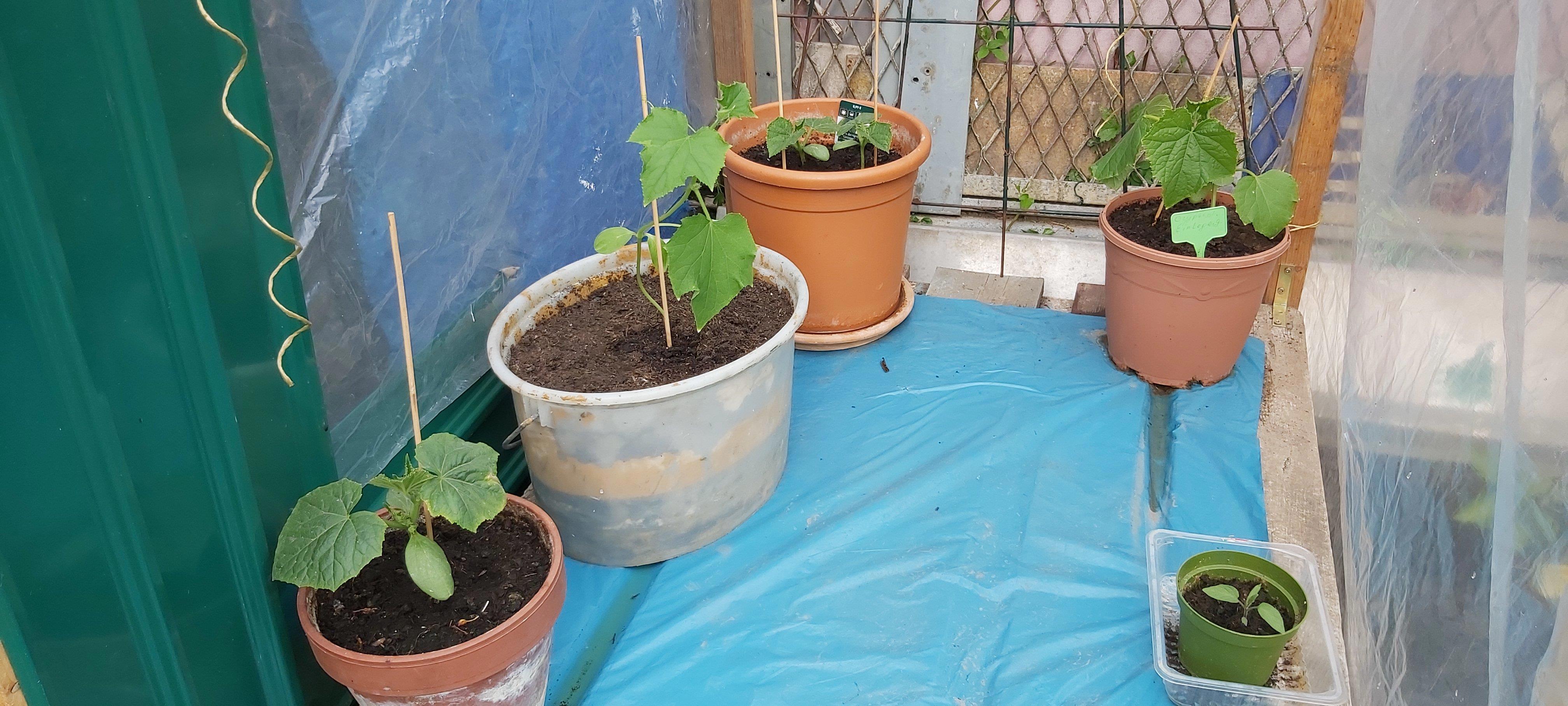 Помидорчики, огуречеки, вдоль забора, баклажан посерёдке и кустик клубнички слева.![]() | Огурцы, в самодельном недопарнике![]() | Те помидоры, что уже большие, это покупные, а махонькие мои детки, слева удва, и справа одын в сером хоршке![]() |