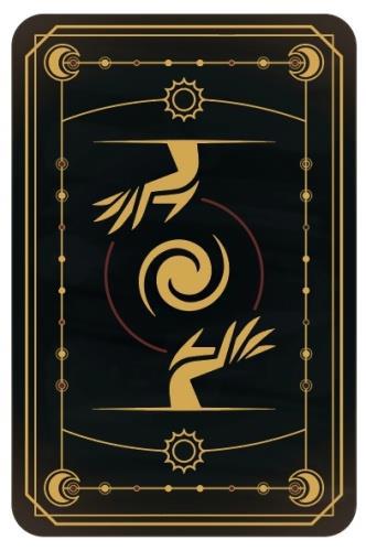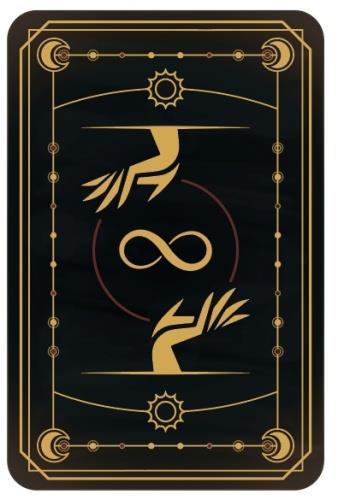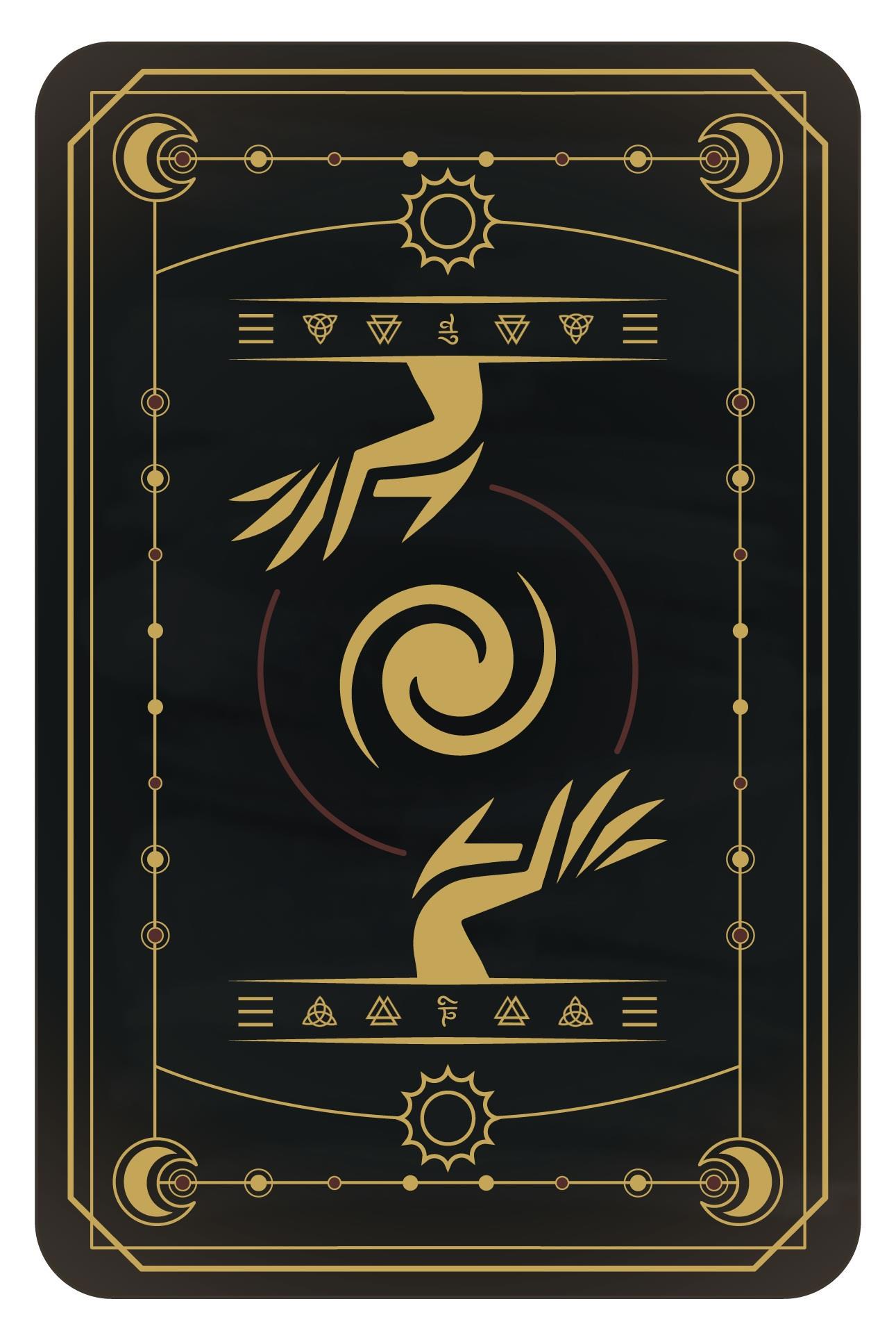 Но я возжелал большего. Я возжелал ещё знаков. И Гариетт нарисовала ещё 7 знаков, один в середине и по три расходящихся. Она придумала взять инсигнии, таким образом связав всю историю персонажа, с традициями Лалангамены, с обложкой карт, и с рукой на обложке.