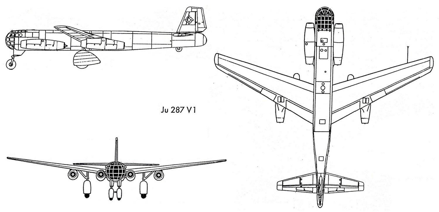 То есть машина не только имела крылья с обратной стреловидностью в 29 градусов, но и во многом другом была новаторской. Известно, что во время испытаний самолёт развил скорость в 550 км в час… ну, это даже для того времени не ахти какой подвиг. Видимо и другие характеристики были далеко не блестящими. Но немцы не успокоились. Вскоре взлетел уже шестимоторный Ju-278V-2: