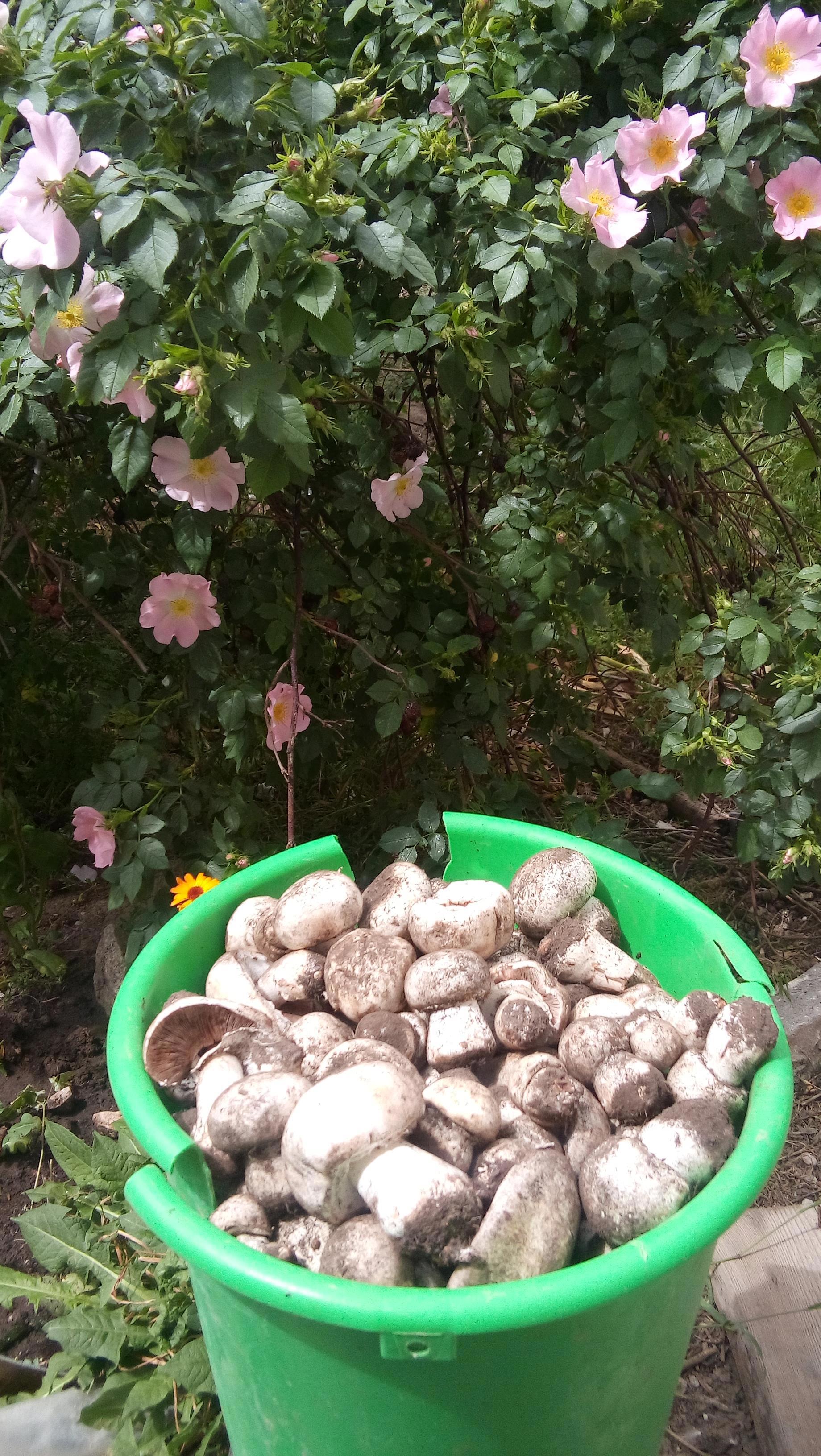 А у меня сегодня случился день неожиданностей. Отправляясь на прогулку с собакой, я ничего с собой не беру, кроме собаки. Погуляли с Ремом вдоль поля пшеницы, и возвращаясь домой, завернули по пути на тепличный. И вот он сюрприз – там и сям торчат пятачки шампиньоньих шляпок. Аккуратно выкрутила из земли грибочки, положила в карман. «На супчик грибной хватит», − думаю. Гляжу, а в сторонке от места, где так основательно копали, ещё видны макушки шляпок. И эти собрала. Оба кармана наполнила, а грибы не заканчиваются. Что делать? Слава человеческой неряшливости… под деревом увидела сломанное пластмассовое ведро. И вот результат.